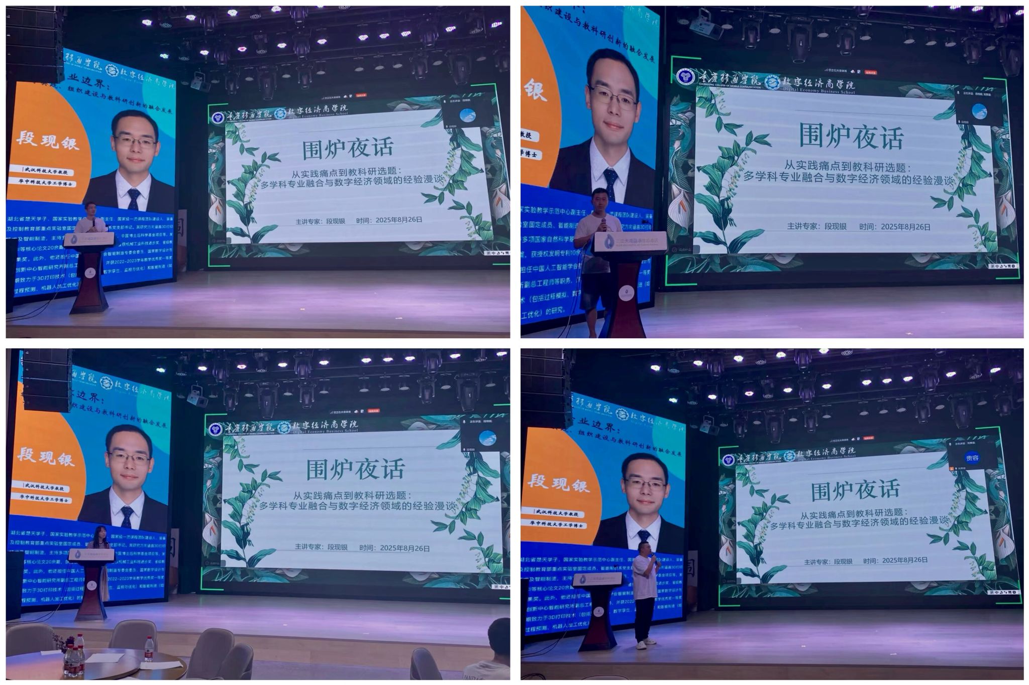 当日围炉夜话环节中,段现银教授与教师们进行了以“从实践痛点到教科研选题:多学科专业融合与数字经济领域的经验漫谈”为主题的线上围炉夜话交流。会上,林子雄老师围绕改革效果的科学判断与评估展开提问,双方探讨了如何从多维度、多层次建立合理的指标体系,以确保改革举措真正落地见效。潘莹老师则结合自身实践,提出翻转课堂中学生课前学习积极性不足的现实困境。段教授指出,除了将任务完成情况计入平时成绩,还可以通过课堂成果展示、小组合作学习、同伴互评等方式激发学生参与的内驱力,同时在教学设计中加入更具吸引力和互动性的内容来提升自学质量。潘莹老师的问题则聚焦于如何在数字经济背景下合理设计教学与科研主题,段教授建议结合行业需求与学科前沿,推动跨学科融合,形成可持续的研究方向。整场交流思想碰撞热烈,既回应了教师在教学一线的实际难题,也拓展了未来教科研发展的思路。