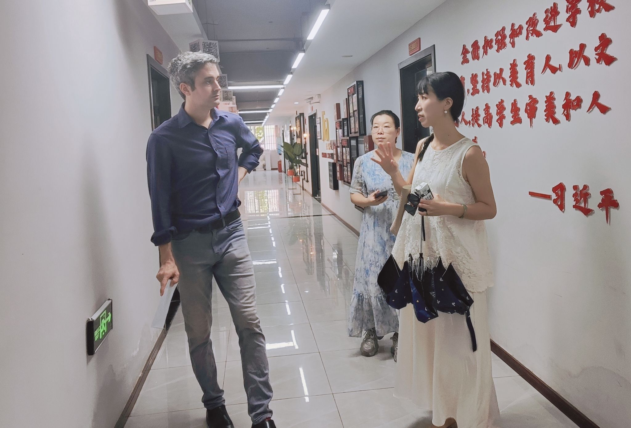 随后,在卢镜囡、黄艳、许合益三位教师的带领下,William 开始参观校园。校园里绿树成荫,鲜花盛开,教学楼现代化,设施齐全。William 对校园的美景赞不绝口,表示很喜欢这里的氛围。在参观过程中,一行人重点带 William 参观了书院,包括荷悦书院、天渠书院、爱莲书院等。这些书院各具特色,书院精心布置的活动空间,给 William 留下了深刻的印象。