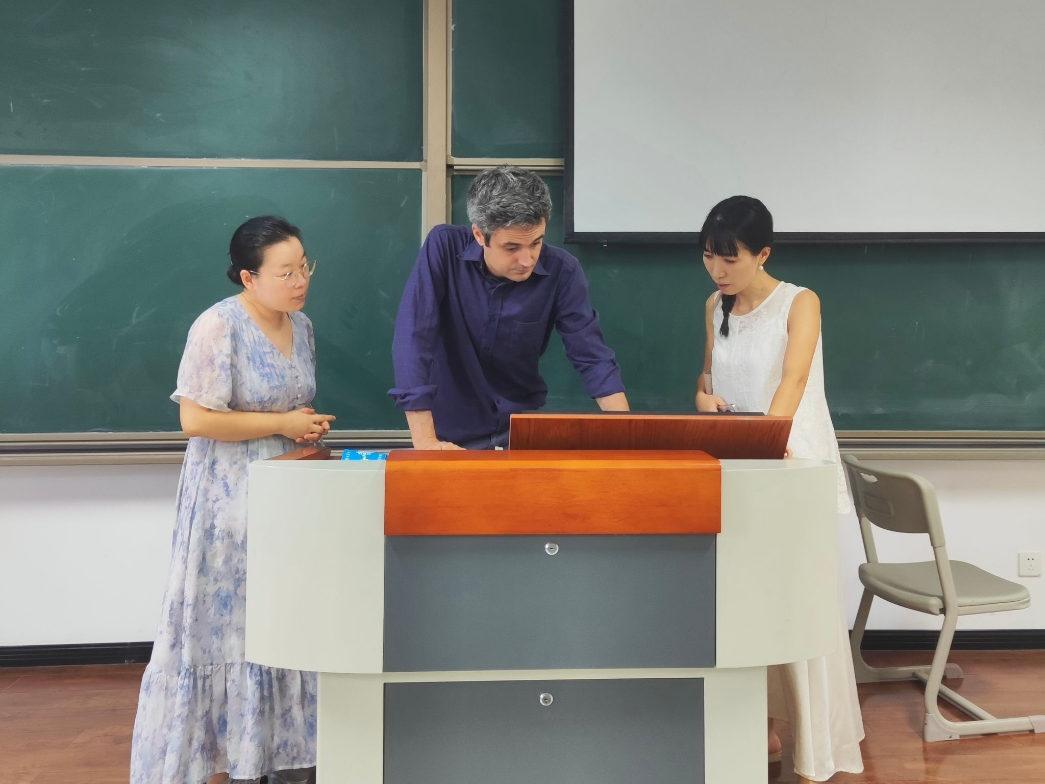 一行教师带William来到教学楼内,他还体验了智慧教室和多媒体设备,这些先进的教学设施让他感到十分惊喜,他认为这些设备能让课堂更加生动有趣,提高教学效果。在智慧教室里,William 亲自操作了一些多媒体设备,如电子屏幕、投影仪等,对这些设备的功能和使用方法有了更深入的了解。他还表示,会充分利用这些设备,开展多样化的教学活动,激发学生的学习兴趣和积极性。