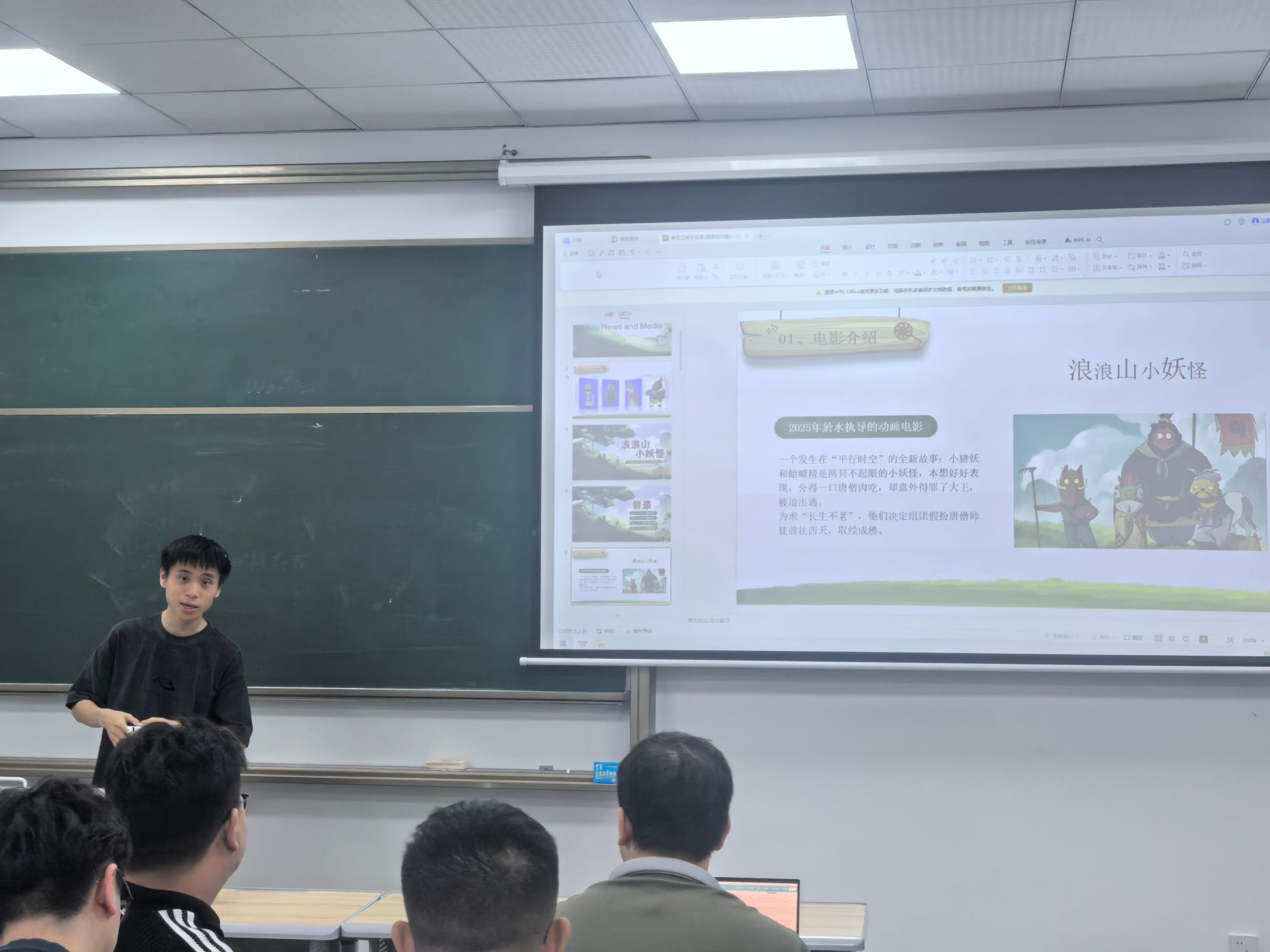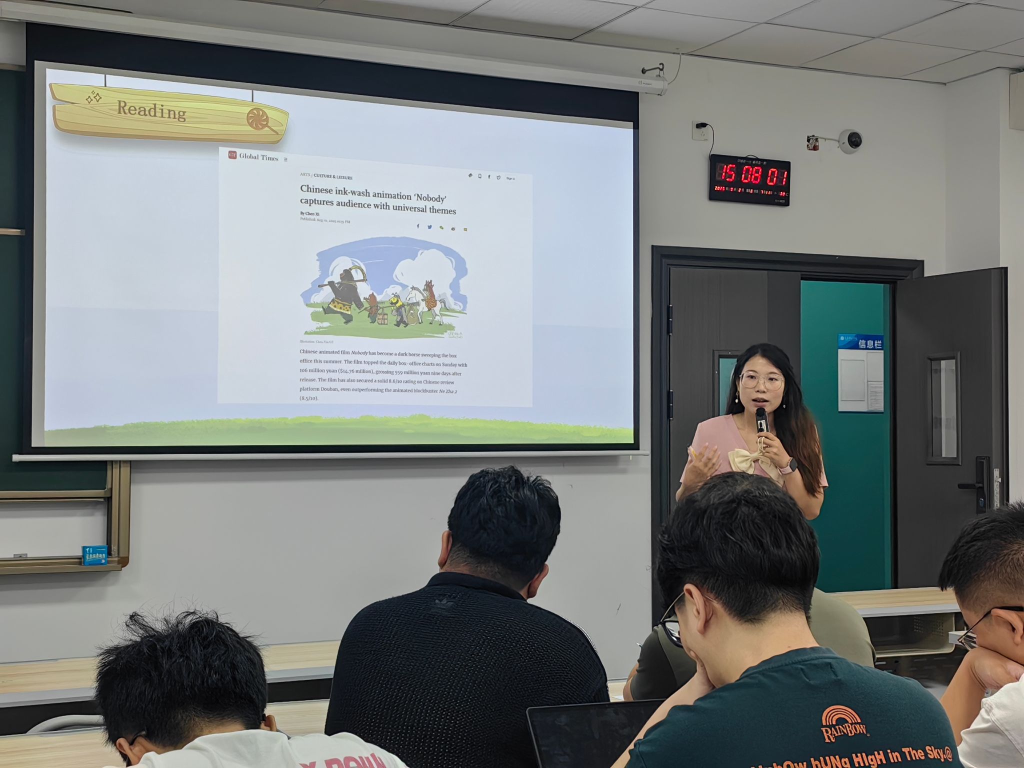 课堂以现象级动画《浪浪山小妖怪》为切入点。“Hi everyone! Did you watch Nobody this summer? Do you think the ‘nobody’ little monsters can become ‘somebody’?” 国际商学院周昊月老师开篇以趣味提问点燃氛围。艺术传媒学院李林飞老师随即从 “共情传播” 视角解析:“浪浪山象征舒适区,小猪妖从‘求安稳’到‘闯西游’的转变,正是‘突破平凡’的写照。影片没给小妖怪起名,却让观众看见自己 —— 平凡不代表平庸,敢迈出第一步就能成为独特的‘somebody’。” 他还结合影片水墨风格、《西游记》彩蛋,点明 “文化传承中的创新,亦是从‘追随’到‘引领’的成长路”。