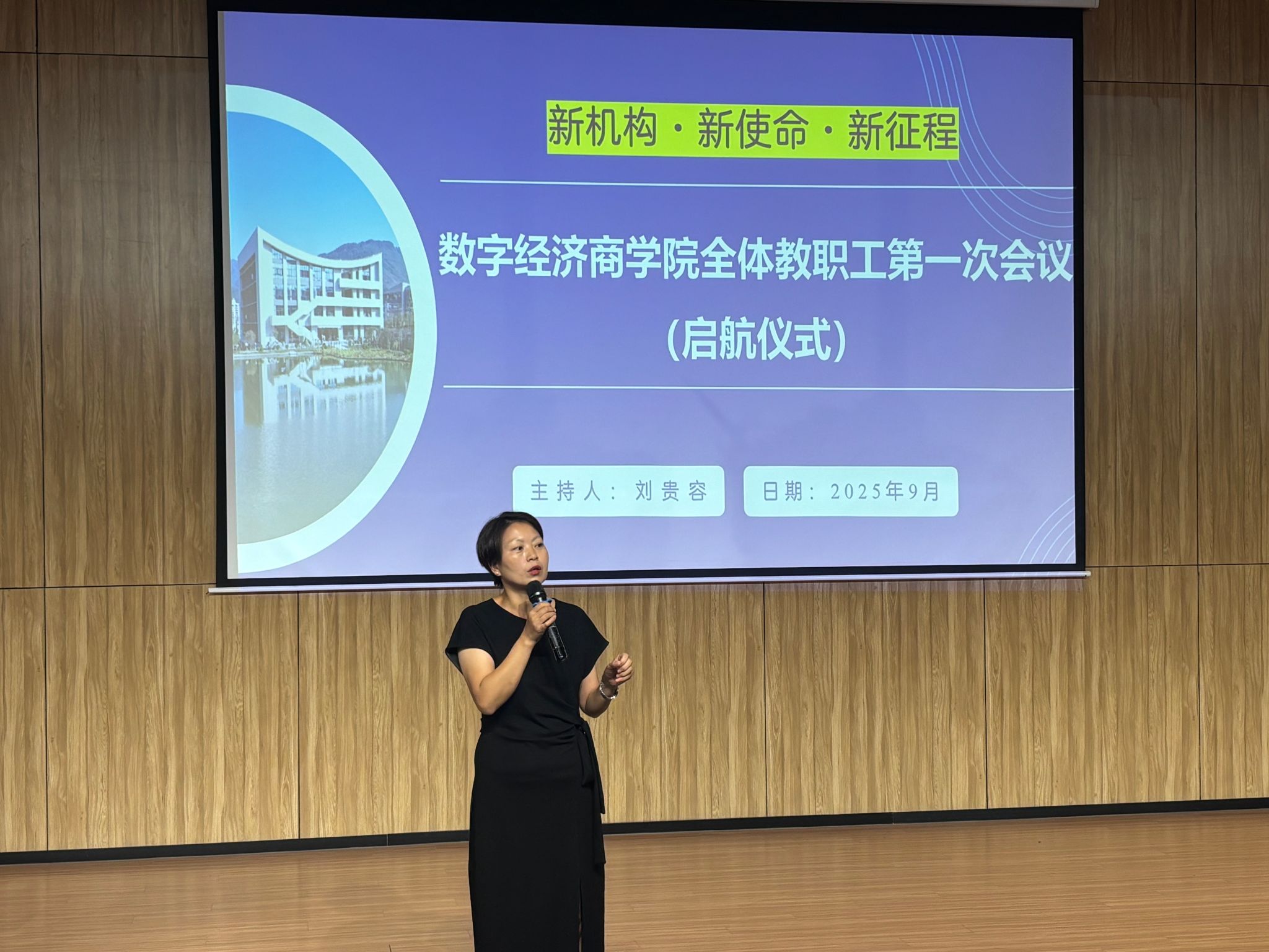 金秋九月,万象更新。为明确学院发展方向、凝聚教职工共识,2025年9月3日下午16:00,数字经济商学院全体教职工第一次会议在贤者楼131多功能报告厅顺利召开。本次以“新机构·新使命·新征程”为主题,校长吕翊、常务副校长王永周、副校长孙玺、校长助理谢银平、人事处科长滕宇等莅临现场指导,与数字经济商学院全体教职工,共同见证学院发展新起点,共商数智商科建设未来路径。