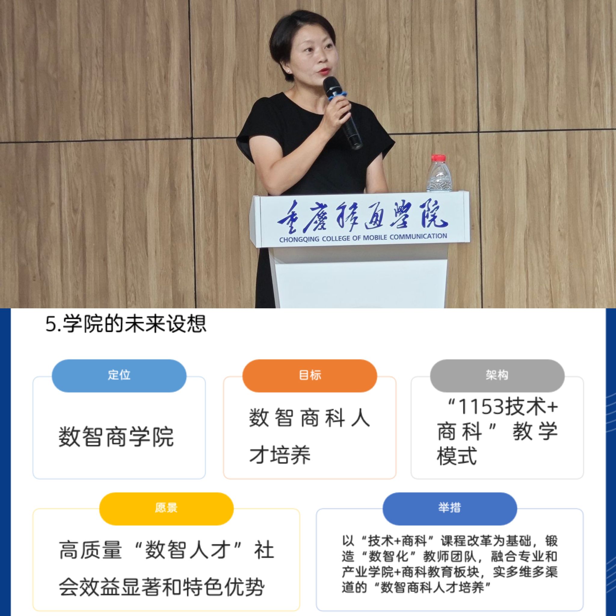 接着,刘贵容院长围绕机构调整后的落地规划,从“专业布局、组织架构、师资力量、发展愿景”四个维度展开解读。在专业布局上,各专业将依托调整后的资源优势,深化课程交叉融合,形成“数智技术+管理能力+国际视野”的复合型人才培养链条;在组织架构方面,强调各部门需以“高效协同”为原则,建立常态化沟通机制,保障教学科研与管理服务工作无缝衔接。同时,刘院长结合学校要求与学院实际,明确提出“使命必达、精益求精、开放协作”的工作准则,培养具备“数智思维、实践能力、国际视野”的高素质数智化人才,实现社会效益显著、特色优势突出的发展目标。