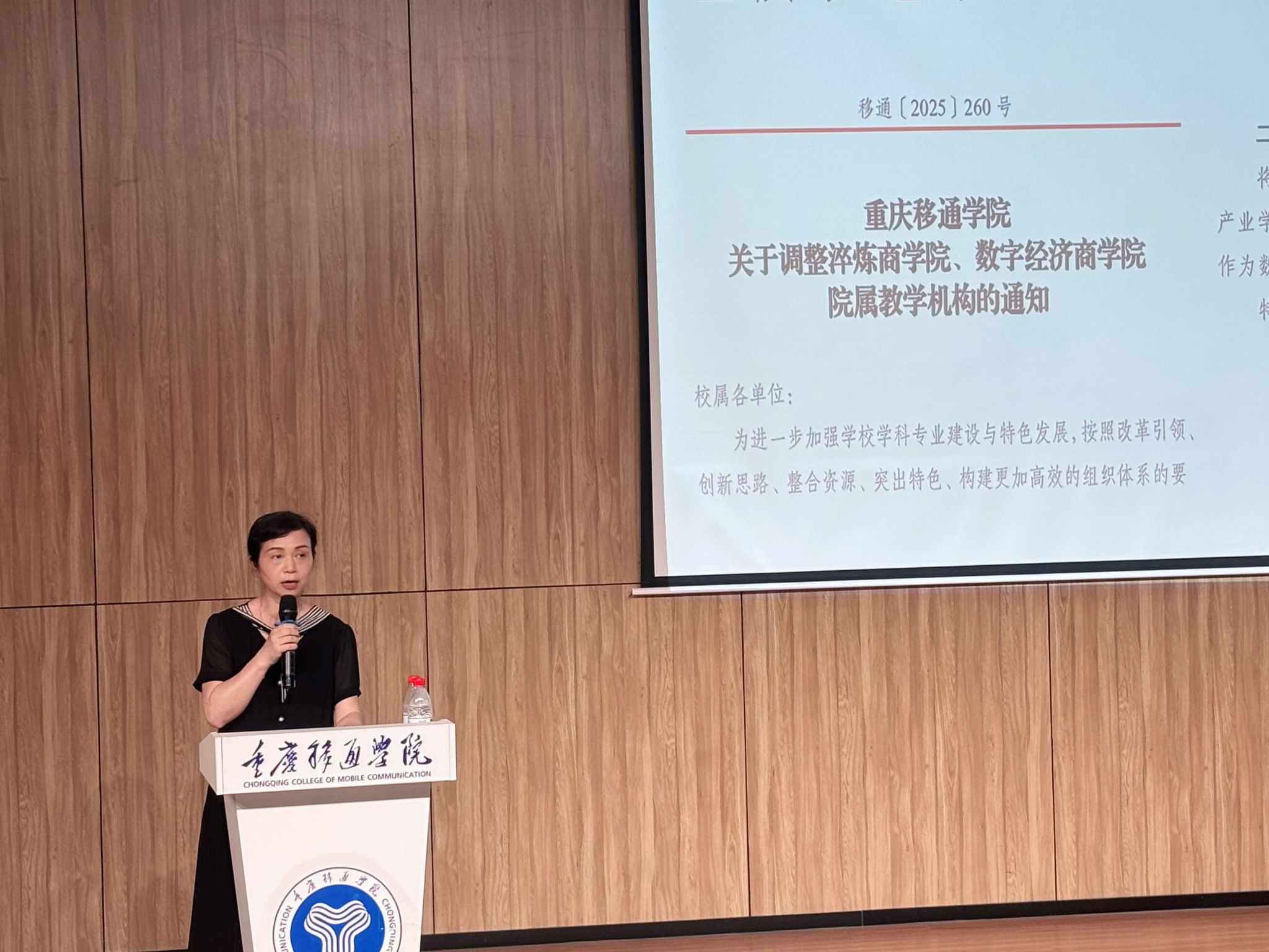 此次会议由数字经济经济商学院院长刘贵容主持。大会伊始,孙玺副校长宣读《重庆移通学院关于调整淬炼商学院、数字经济商学院院属教学机构的通知》文件,从学校战略发展与数字经济学科建设的全局高度,阐明此次机构调整的意义,也是学校优化院系布局、强化数商专业集群优势的关键举措。
