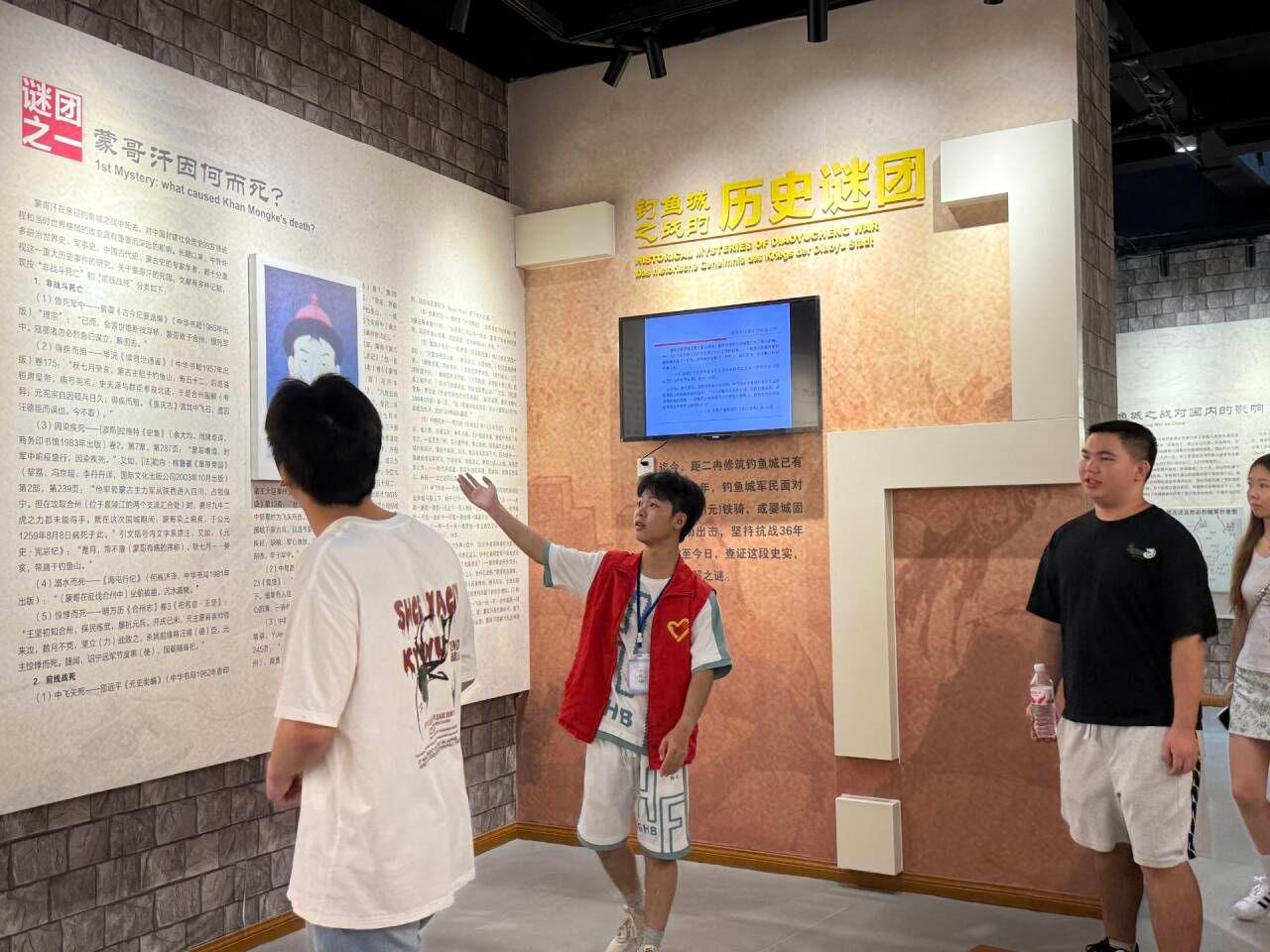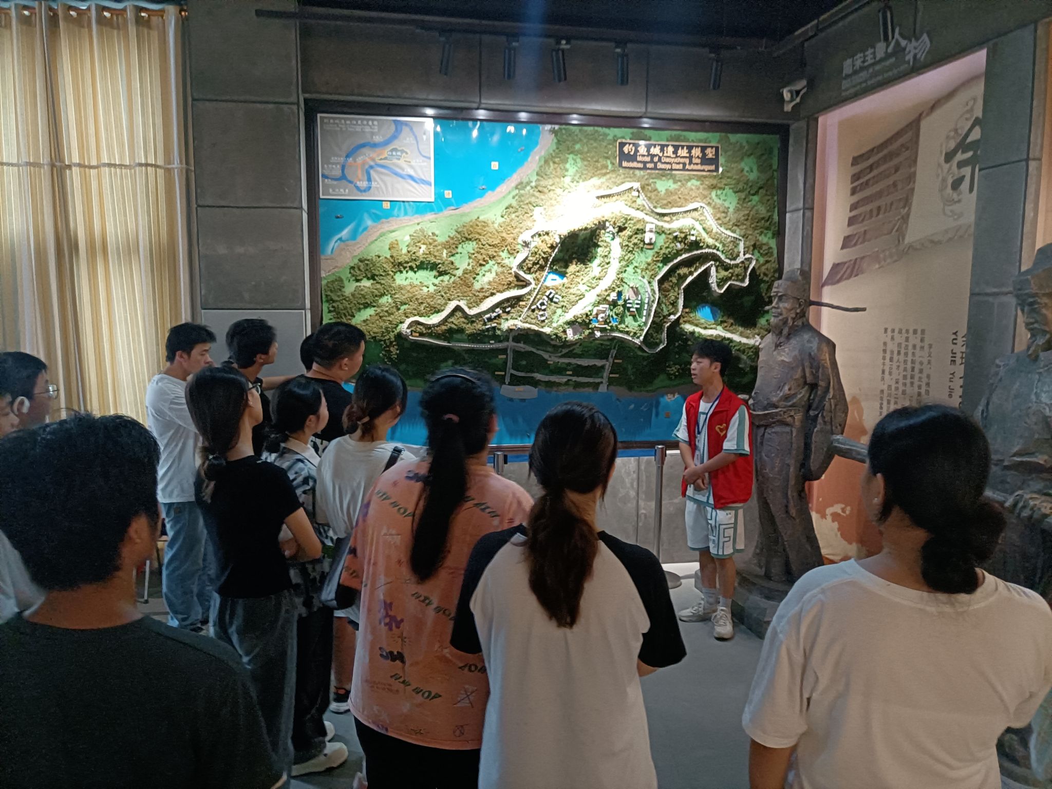 沿着参观路线,师生们来到“时代风云”展区。这里以时间为轴,通过照片、文献资料等展品,串联起钓鱼城的变迁历程。从独钓中原抗击蒙古铁骑,到如今作为“国家级文物保护单位”的文化价值,原来钓鱼城不仅有悲壮的战事,更有代代相传的保护与传承。师生们一边聆听讲解,一边认真记录,对钓鱼城的历史价值有了更全面的认知。