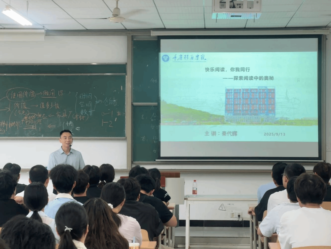 首先,图书馆馆长秦代辉以“快乐阅读,你我同行”为主题开启了分享环节。秦老师强调:“作为大学生,应坚韧不拔,做最真实的自己,并珍视变量与长期坚持的价值。”随后,他推荐了经典著作《了凡四训》,结合书中的智慧引导同学们感受阅读的力量。最后,围绕“快乐阅读的必要性”“何为快乐阅读”“如何构建阅读体系”三个核心问题展开深入讲解,鼓励同学们将阅读融入日常生活,在文字中探索乐趣、提升自我。