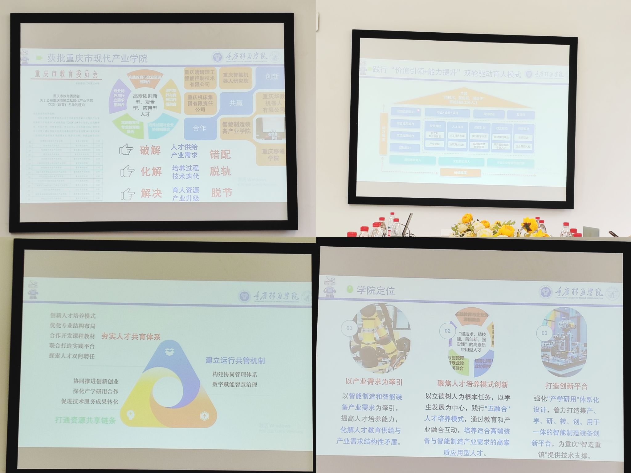 随后,党晓圆院长就产业学院建设进展及重点内容作专题汇报。她以“践行“价值引领+能力提升”双轮驱动育人模式”为汇报主题,系统梳理了学院在课程资源建设、校企共同授课、订单班建设、学生实习实训、师资队伍建设、实践教学中心建设、共同申报科研项目、发明专利情况等方面取得的阶段性成果,并指出产业学院下一步将夯实人才共育体系、建立运行共管机制与打通资源共享链条三个方面作为推进要点工作。党院长表示,学院将紧扣智能制造产业发展需求,深化教育教学改革,强化校企资源整合,打造特色鲜明的现代产业学院。