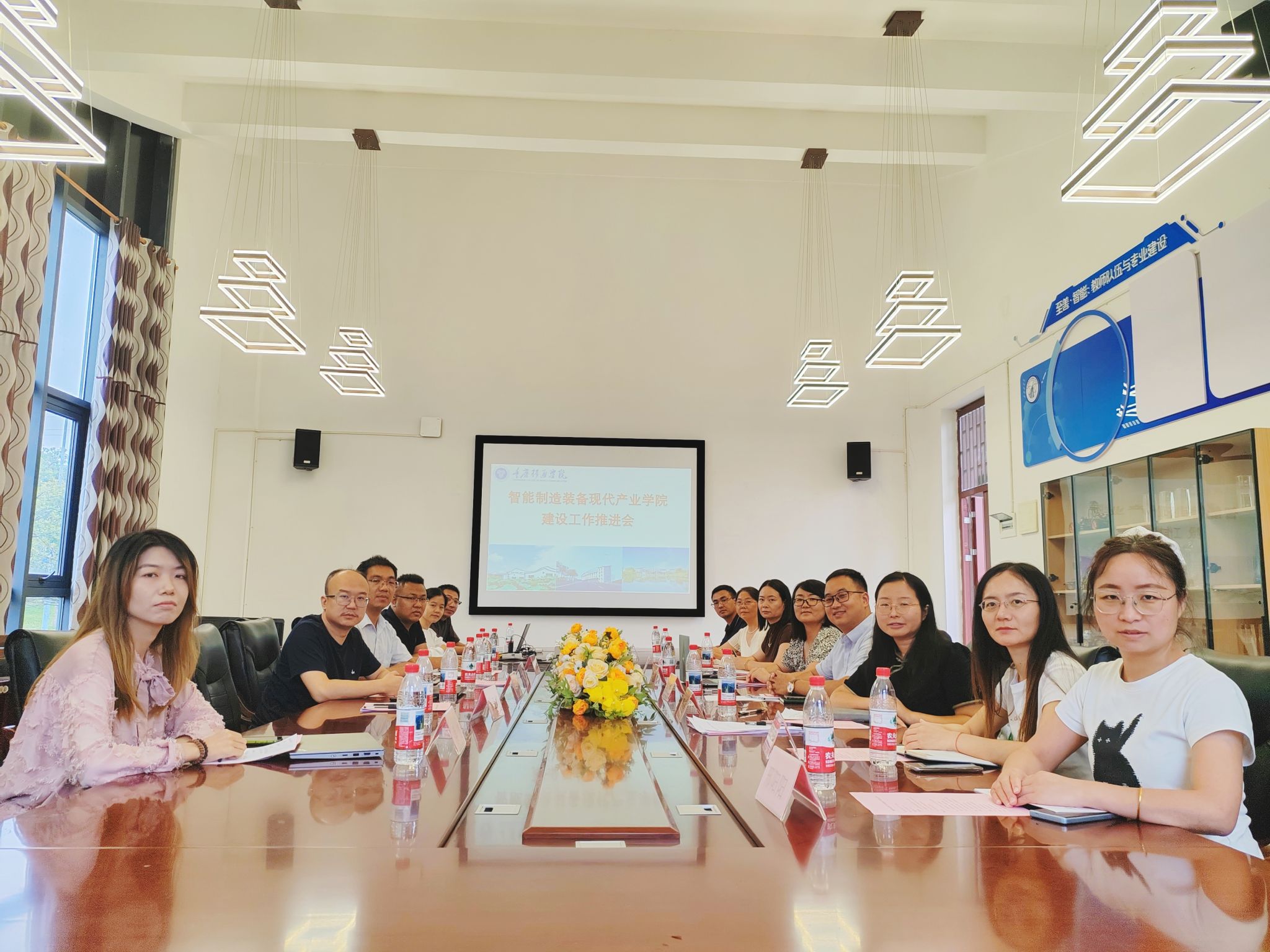 为深入贯彻落实国家“制造强国”战略,主动适应新一轮科技革命和产业变革对高素质工程技术人才的需求,扎实推进重庆市第二批现代产业学院——智能制造装备产业学院建设,9月17日上午十点半,智能制造装备现代产业学院在梅若207会议室召开了建设工作推进会议,旨在总结前期成果、明确重点任务,并深化校企协同合作。重庆华数机器人有限公司研发副总经理兼智能制造装备产业学院理事长夏亮、重庆智能机器人研究院院长助理陈才、重庆清研理工智慧工厂设计研究院总经理文森涛、重庆清研理工智慧工厂设计研究院高级产品经理余亚婷、重庆清研理工智慧工厂设计研究院市场专员吴悠,重庆移通学院发展规划与科研处副处长刘建川、智能制造装备产业学院院长党晓圆、智能制造装备产业学院副院长李洁及智能工程学院各教研室主任出席本次会议。