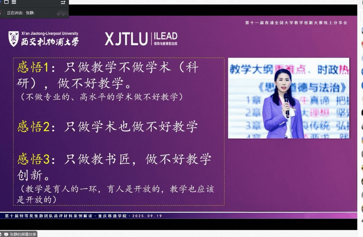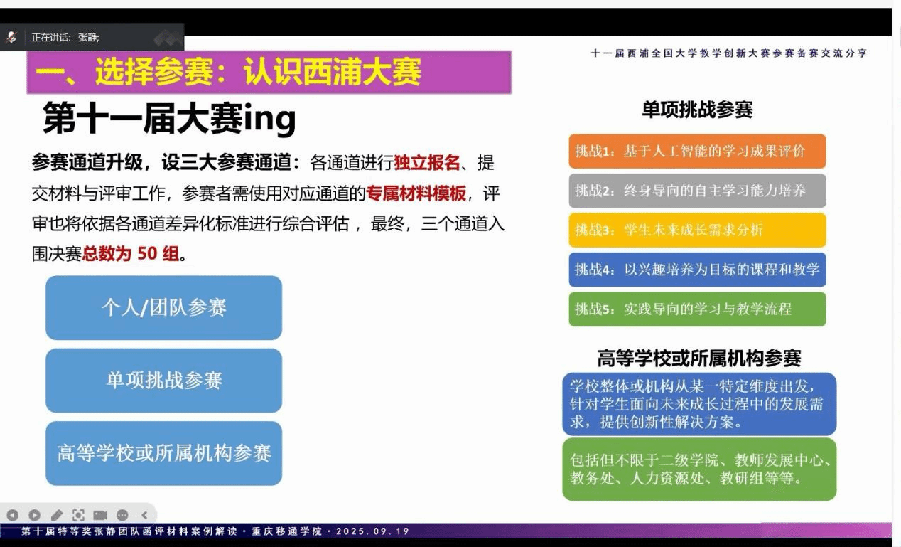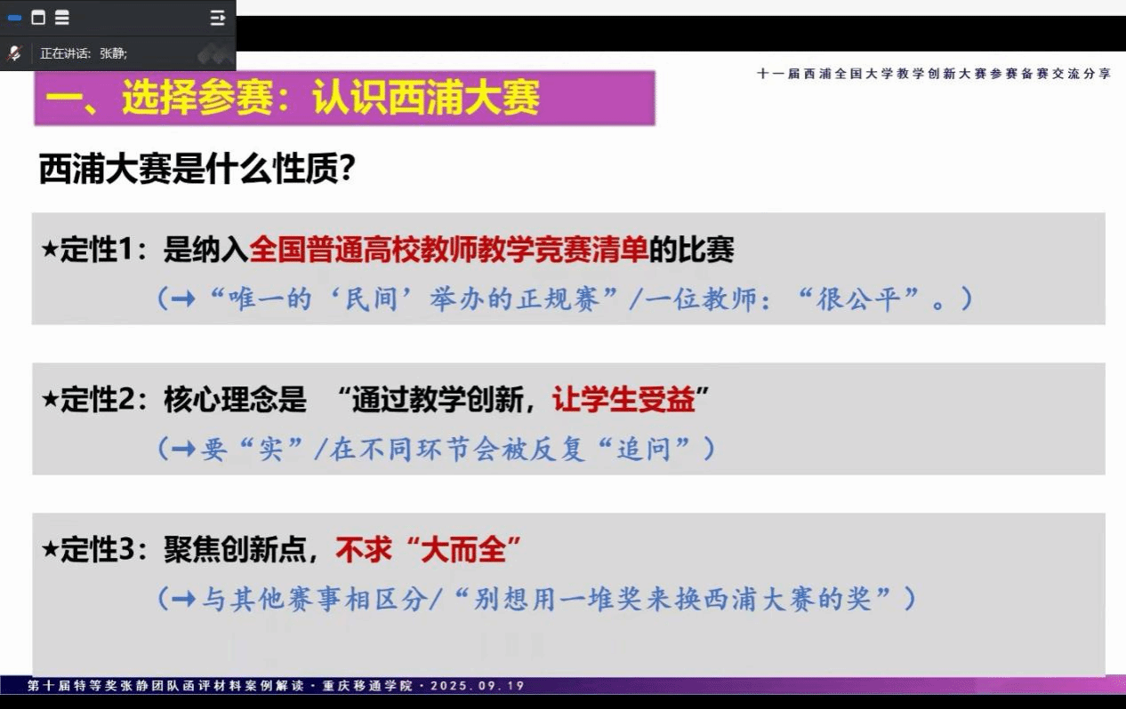 张静老师为参会老师解析了西浦大赛的特色,作为全国性开放赛事,其以“单点突破与创新性”为核心,聚焦教学痛点,与强调系统性的全国高校教师教学创新大赛形成互补。她指出,参赛材料需紧扣“问题、创新、证据、传播”四大维度,通过逻辑清晰、重点突出的结构化呈现,便于评委快速抓取关键信息。