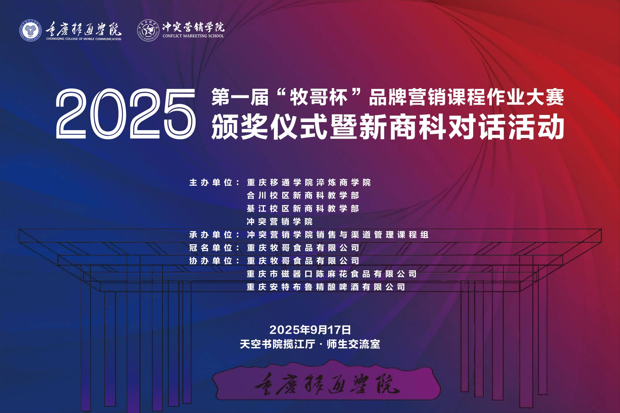 9月17日下午,第一届“牧哥杯”品牌营销课程作业大赛颁奖仪式暨新商科对话活动在重庆移通学院天空书院揽江厅·师生交流室隆重举行。本次活动由重庆移通学院淬炼商学院、冲突营销学院、新商科教学部联合主办,冲突营销学院《销售与渠道管理》课程组承办,重庆牧哥食品有限公司冠名支持。重庆市磁器口陈麻花食品有限公司、重庆安特布鲁精酿啤酒有限公司赞助支持。大赛以植入课程的校企共建方式展开,旨在表彰优秀学生作品,推动产教融合,深化新商科建设与品牌营销人才培养。