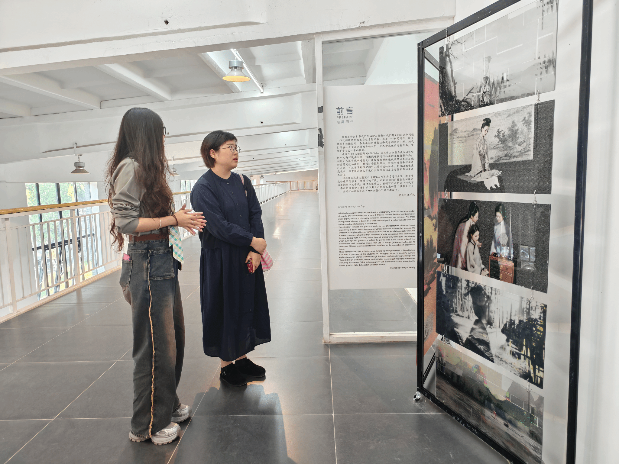 《大众摄影》编辑部新媒体部徐晓刚主任对学生作品产生了浓厚的兴趣,听取师生的介绍后,就其中的创作细节进行了交流,并与申欣露同学合影留念。