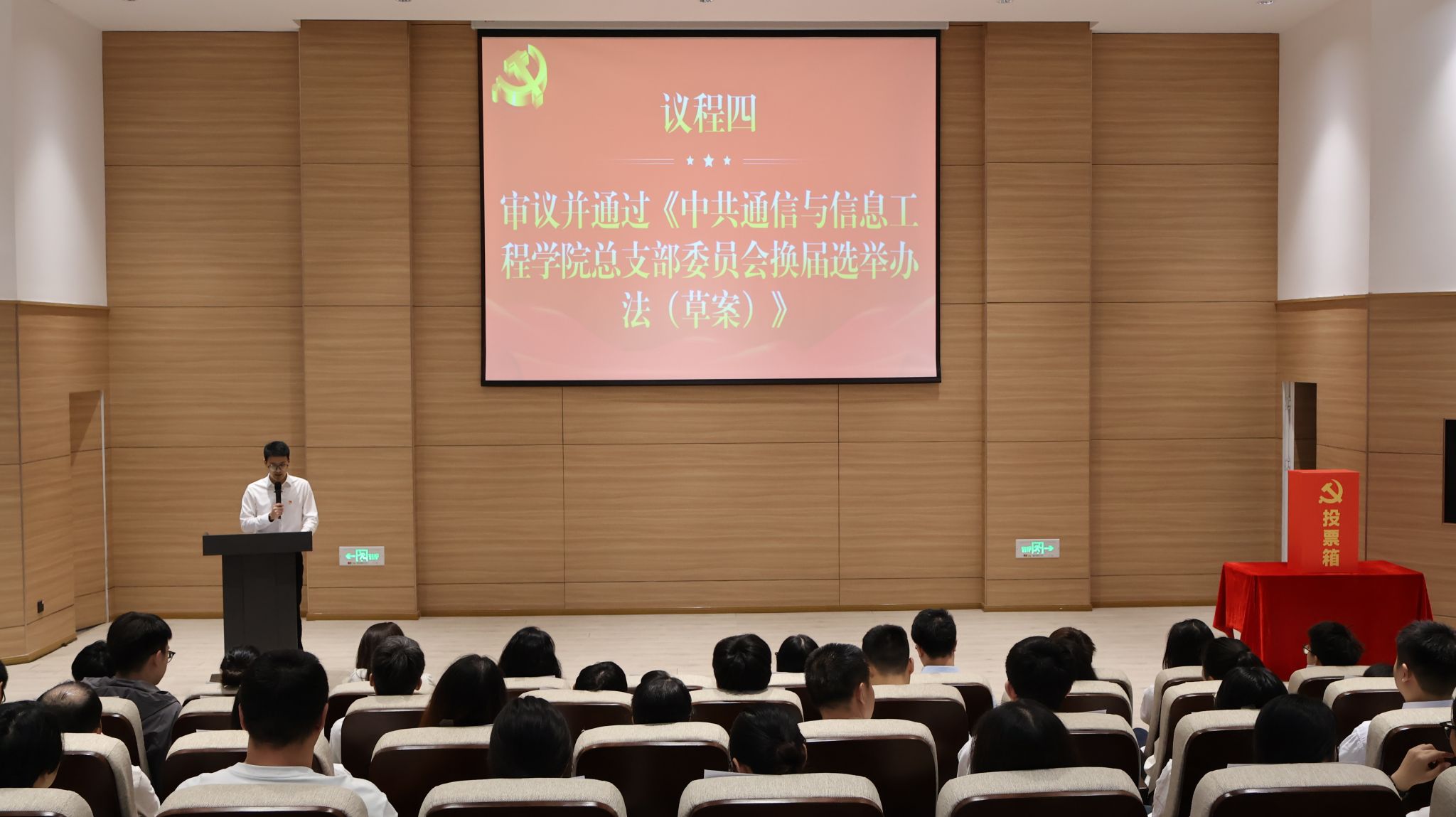 会议审议并通过《中共通信与信息工程学院总支部委员会换届选举办法(草案)》及候选人名单。在监票人监督下,与会正式党员以无记名投票方式,差额选举产生新一届党总支委员会委员。