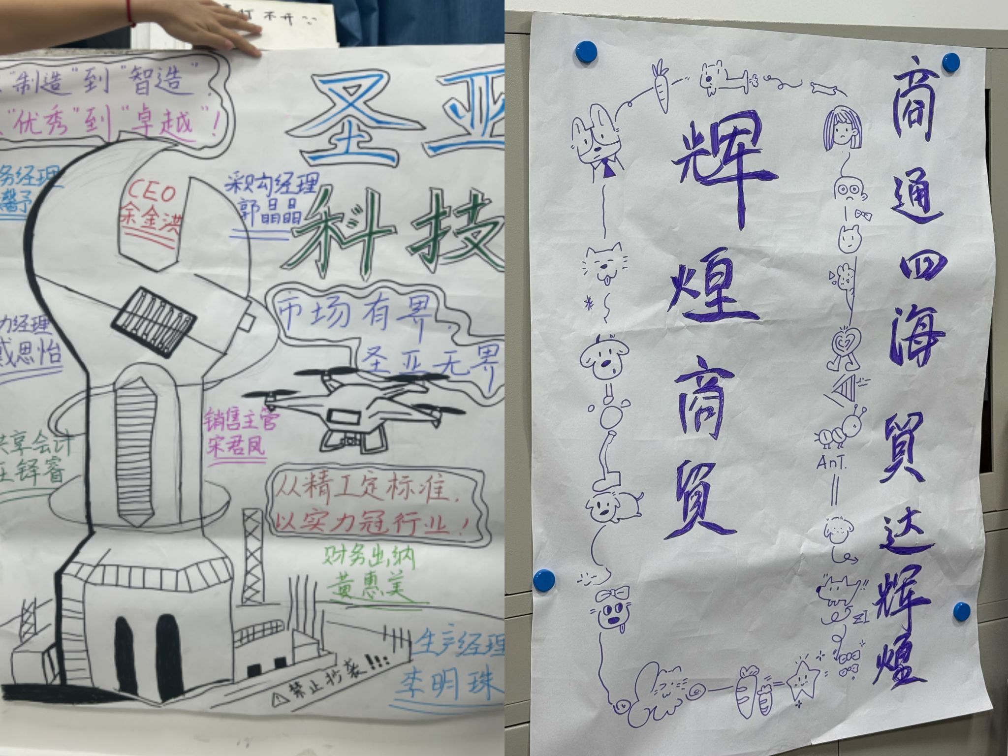 随后,同学们以小组为单位组建“模拟企业”,并进入企业海报设计环节。各团队分工明确,从品牌定位、设计风格到视觉元素,均经过反复推敲与优化。跨专业思维的碰撞使得每一张海报既彰显企业特色,又体现了专业融合的巧思。