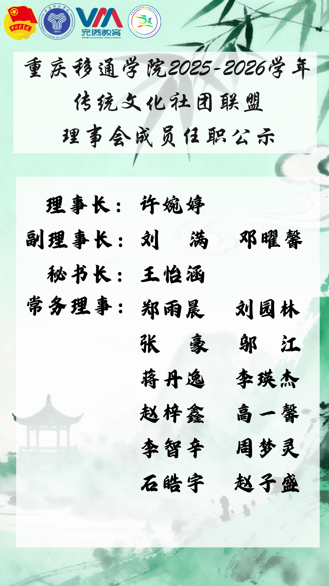 此次会议在团结、务实、奋进的氛围中圆满落幕。新一届理事会表示,将不负众托,携手各社团共同推动传统文化在校园中的传承与创新,为构建高质量校园文化生态贡献力量。为确保上述目标的实现,进一步完善联盟组织建设, 我校传统文化社团联盟于9月19日组织了理事会职务竞选工作,旨在选拔能力突出、责任心强且热爱传统文化工作的成员。经面试竞选与集体决议,现将2025-20256学年传统文化社团联盟理事会成员任职公示如下: