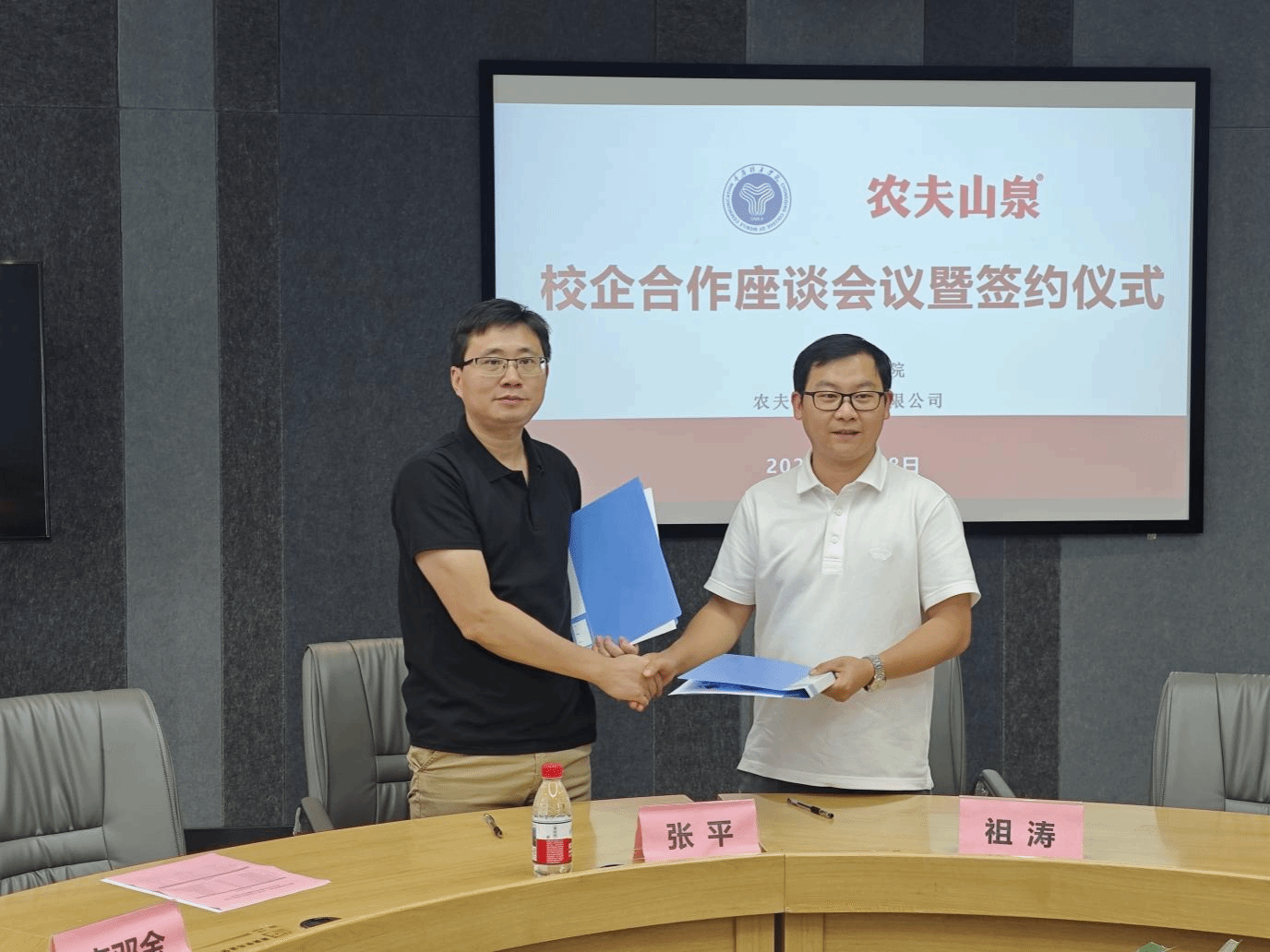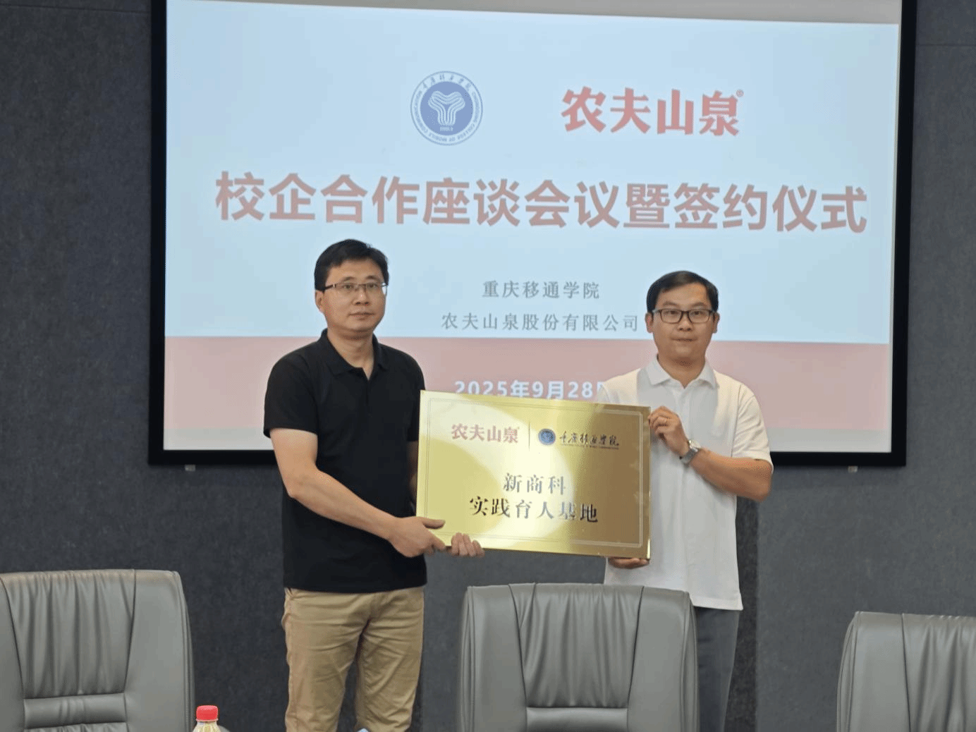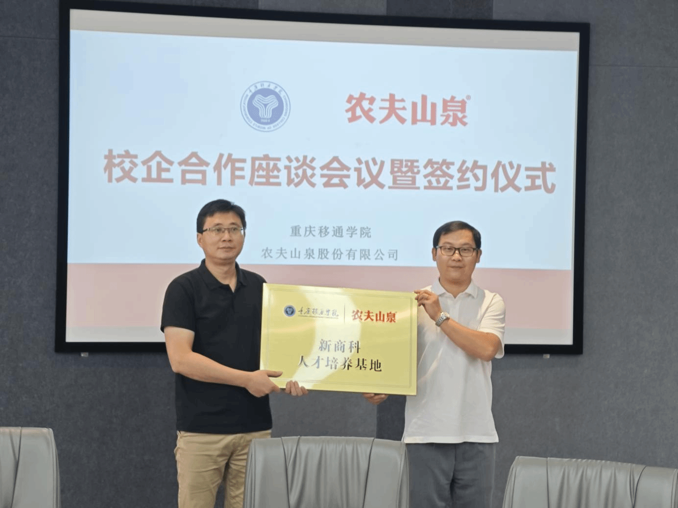 随着双方在合作细节上的初步共识达成,重庆移通学院校长助理张平与农夫山泉大区总经理祖涛共同签署了校企合作协议,正式启动了双方的合作项目。随后,双方又举行了学生实践基地的授牌仪式。