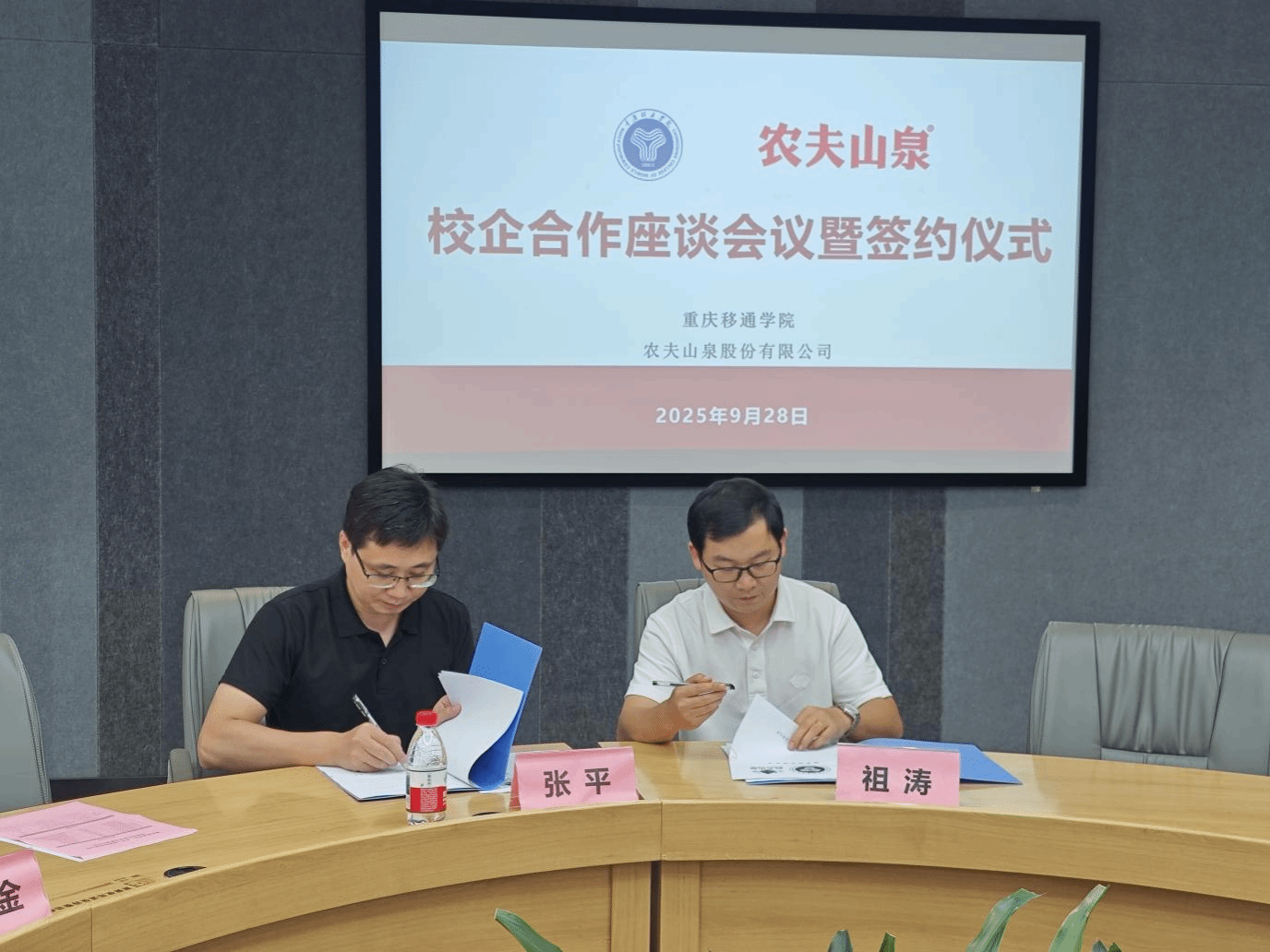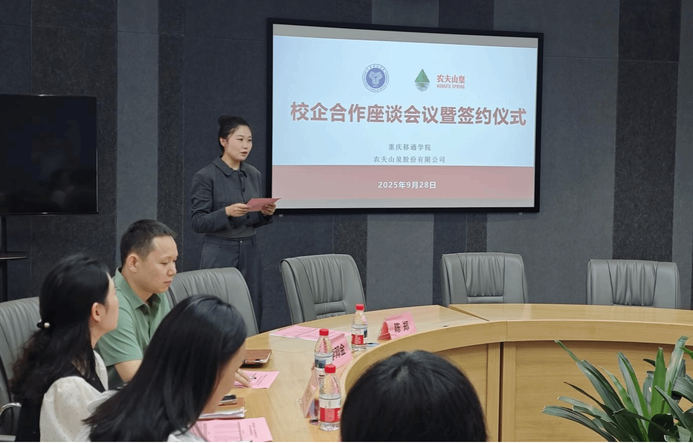 9月28日,重庆移通学院与农夫山泉股份有限公司在南湖书院圆桌会议室举行了校企合作座谈会暨签约仪式。本次签约旨在推动产学研融合,提升学生的实践能力,并为企业注入创新动力,促进双方共同发展。签约仪式上,重庆移通学院校长助理兼淬炼商学院院长张平、淬炼商学院党总支书记刘薇唯、副院长曾璐、学工办主任杨伦芳、基础教研室主任李邓金以及校企合作专项负责人陈郑,农夫山泉股份有限公司大区总经理祖涛、大区销售部经理李庆、办事处经理董志刚、人事主管张静、新媒体负责人王颖出席了签约仪式,共同见证这一重要时刻。签约仪式由卫晨熙老师主持。