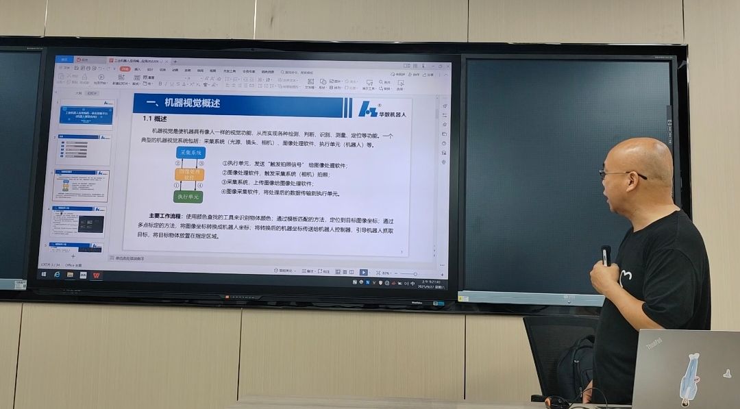 刘祥荣工程师不仅讲解了每个步骤的原理与算法逻辑,更着重强调了其在真实产线,如汽车焊接、电子装配、物流分拣等场景中的实际应用与精度要求。学员们从最初对设备感到陌生,到能够亲手操作机器人,引导视觉系统精准识别、定位并完成抓取指令,实现了从理论到实践的跨越式突破。