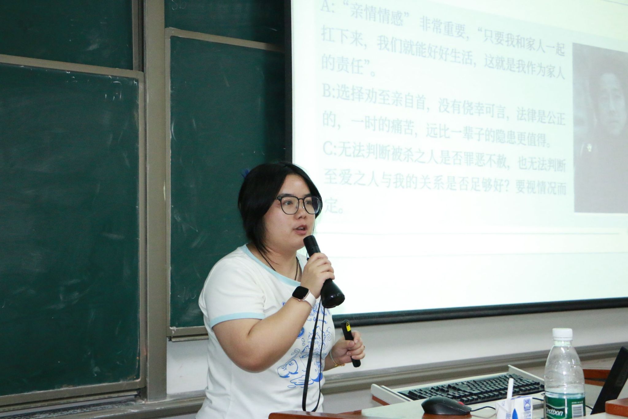 围绕《嫌疑人X的献身》,黄娟老师以“推理小说的悬念重构”为核心,引导学生思考“开篇揭示凶手却仍具吸引力”的叙事技巧,拆解故事的悬念设计逻辑;郭慧阳老师聚焦“空间的社会性”,对比中日韩三版电影对“流浪汉聚集地”“便当店”等场景的差异化呈现,分析空间描写背后的社会文化内涵;邓丽娟老师则从思政视角切入,围绕“亲情与法律的边界”设计学习通投票与AI互动环节,结合石神“牺牲无辜流浪汉守护爱人”的情节,引导学生辨析“情感与底线”“个人与他人”的关系,传递“正义是对所有人公平”的法治理念与人文关怀。