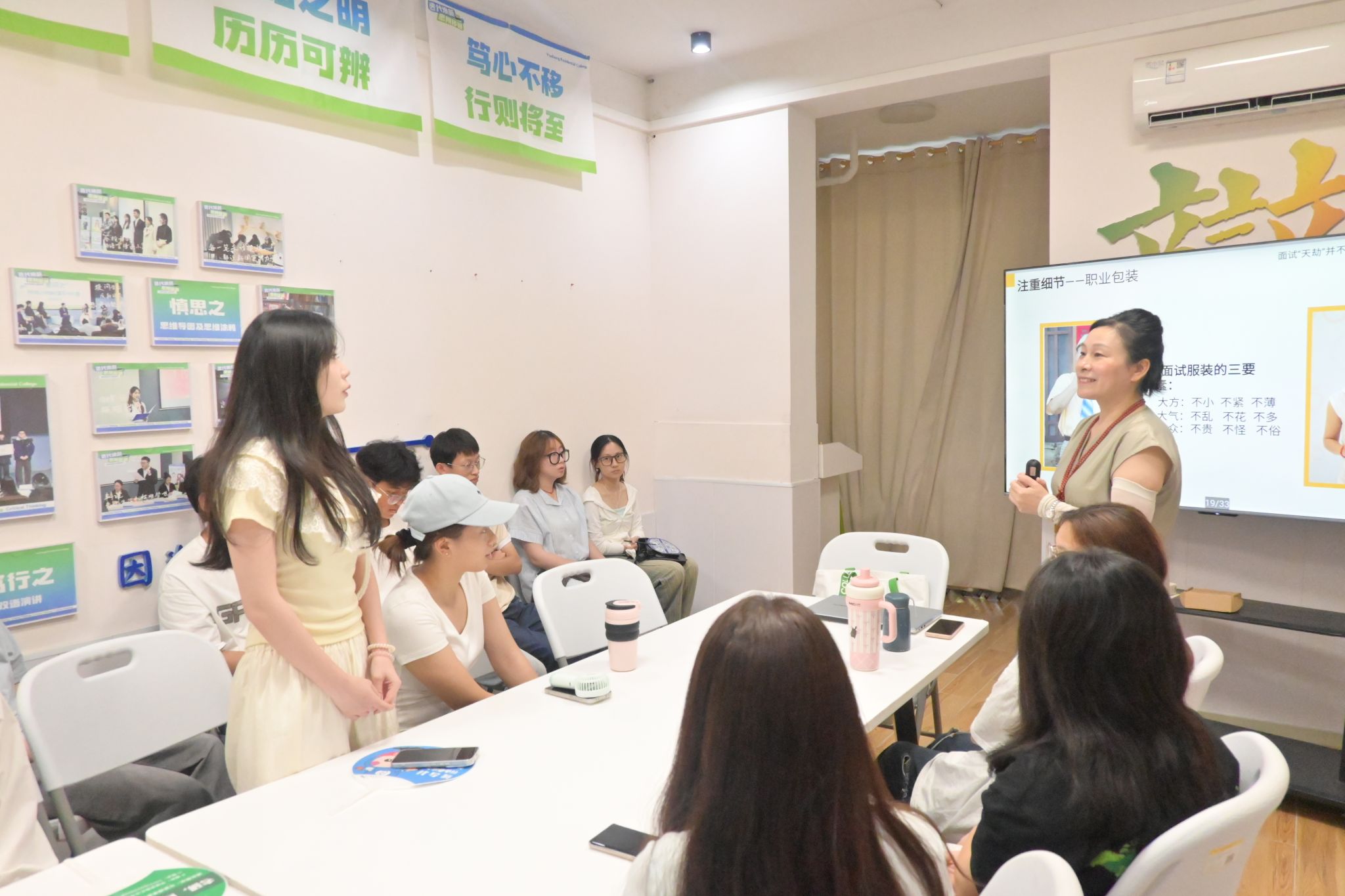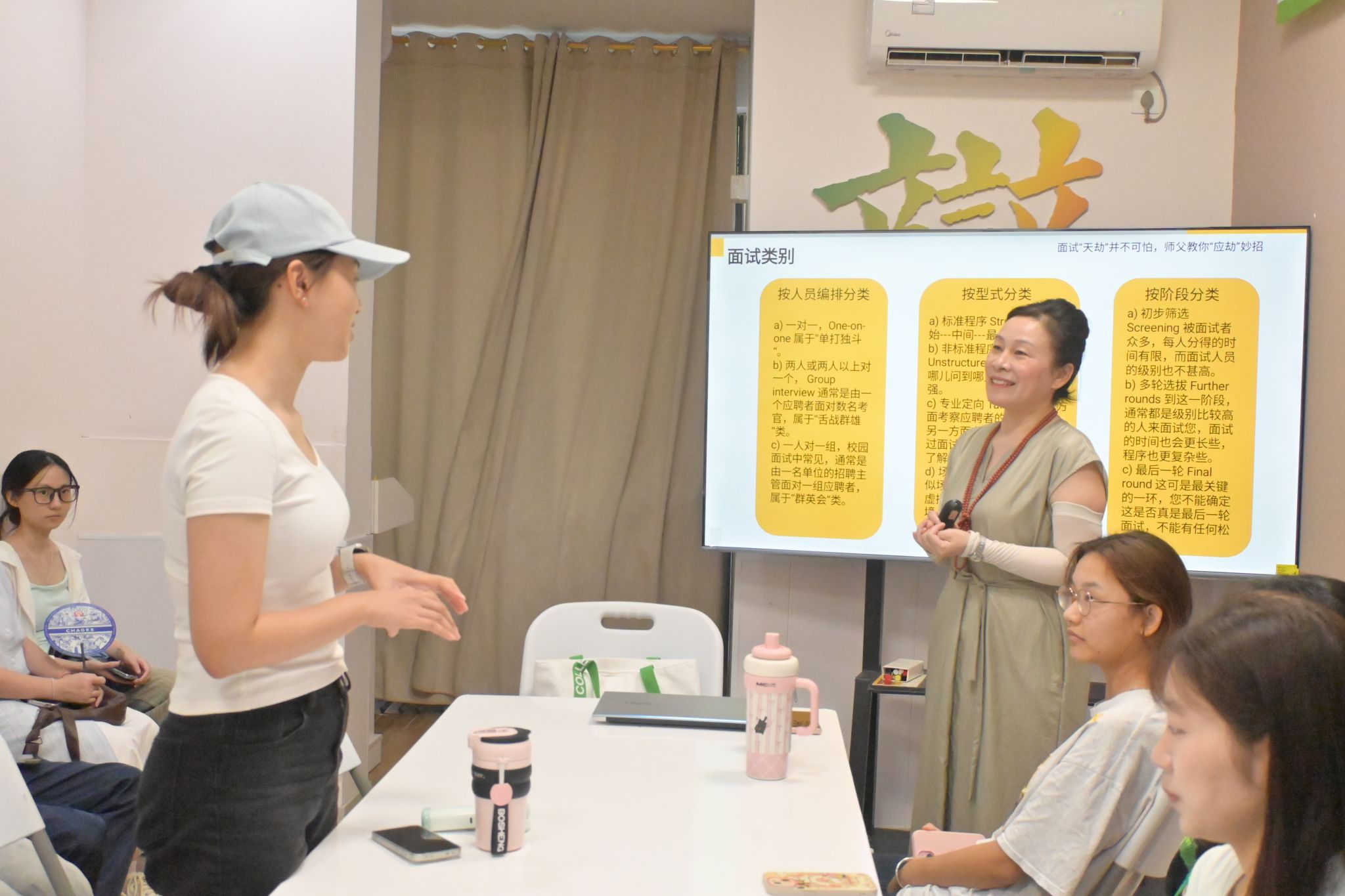 活动中老师以其独特的“双栖”导师视角,将深厚的企业实务积淀与教学智慧融为一体。不仅以互动研讨的形式,深入剖析了从结构化面试到无领导小组讨论等各类面试形式的核心要点,更引导学生构建系统性认知,理解面试官问题背后的能力诉求。在随后的实战模拟环节,学子们踊跃发言,亲身体验面试场景,杨老师则针对每位学生的表现,从语言表达到非肢体语言,从逻辑架构到临场应变,给予了精准而细致的点评与指导,现场气氛热烈,充满了思辨与启迪。