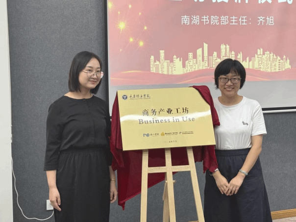 本次开班典礼还有一个重磅环节:工坊授牌仪式。酒店商务产业学院联合南湖书院成立了“business in use”工坊,为实训班提供更广阔的课程实践与技能活动平台,标志着校企院“资源共享、协同育人”的新起点。未来愿景,签约更多知名酒店、企业及文旅项目;成为区内酒店商务人才培养标杆;构建“培养-就业-行业服务”生态链,助力产业高质量发展。