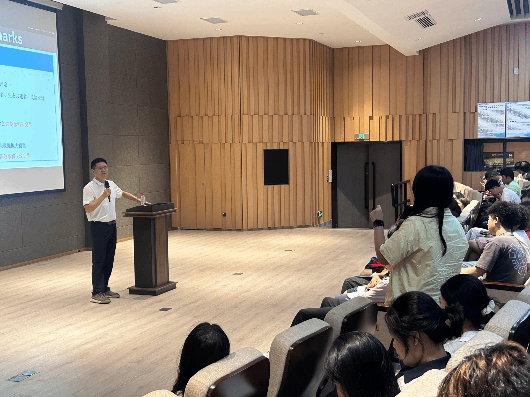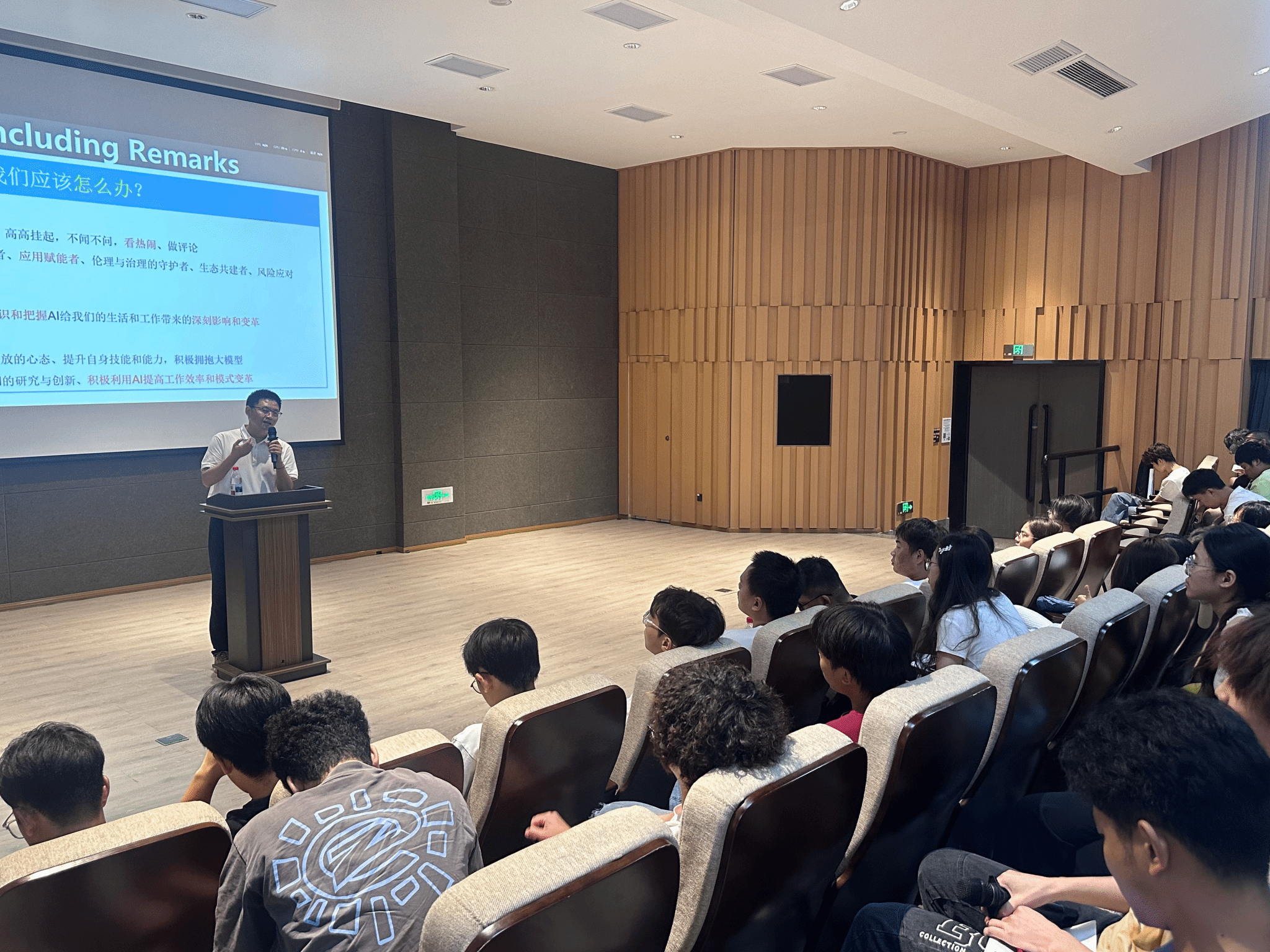 在互动环节,台下一位同学起身提问,现场互动热烈。唐教授专业且耐心的解答,为同学们在AI浪潮下规划职业发展、明确任职方向提供了极具价值的指引。最后,唐教授总结发言,明确了AI在大学学习的重要性,让也让大家对未来职场中如何与AI共生、提升自身竞争力有了更清晰的认知。