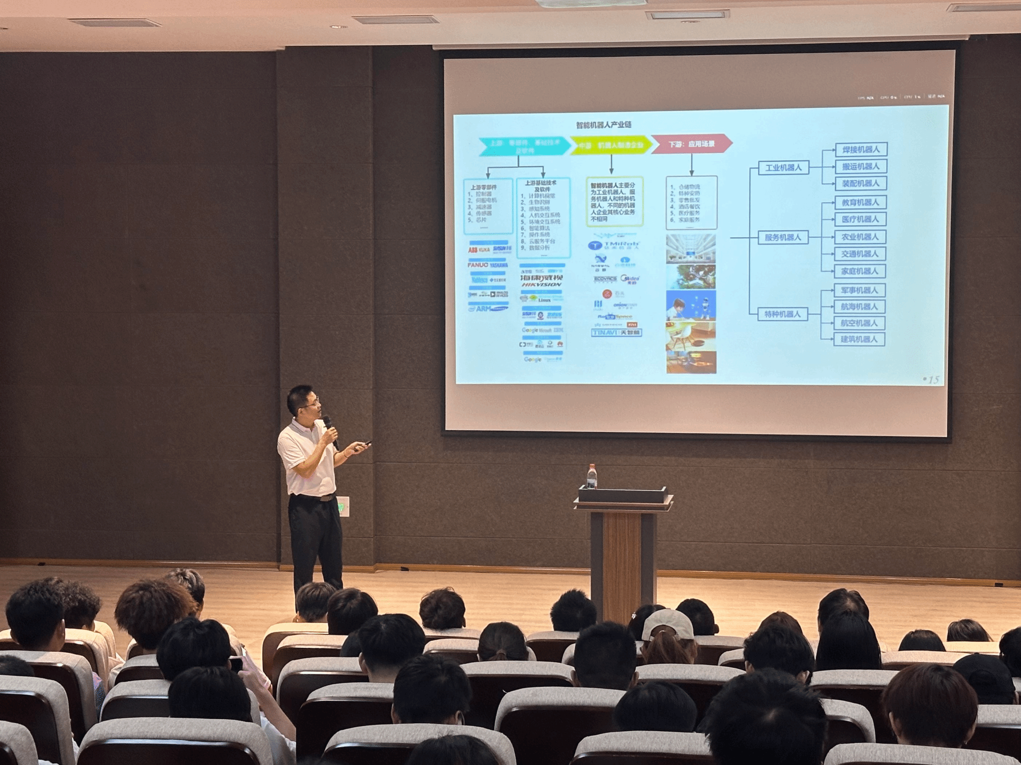 这是一场关于智能机器人产业链的专题讲座上,唐教授正站在讲台上,以清晰且富有逻辑的讲解,为台下众多听众剖析智能机器人产业链的上游零部件与基础技术、中游主要企业以及下游丰富的应用场景。从工业机器人到服务机器人,再到特种机器人,每一个细分领域都在他的讲解下变得清晰易懂。台下的听众们或认真聆听,或拿出手机记录关键内容,整个会场沉浸在对智能机器人产业前沿知识的探索氛围中,唐教授专业且深入的分享,为大家打开了一扇了解智能机器人产业全貌的大门。
