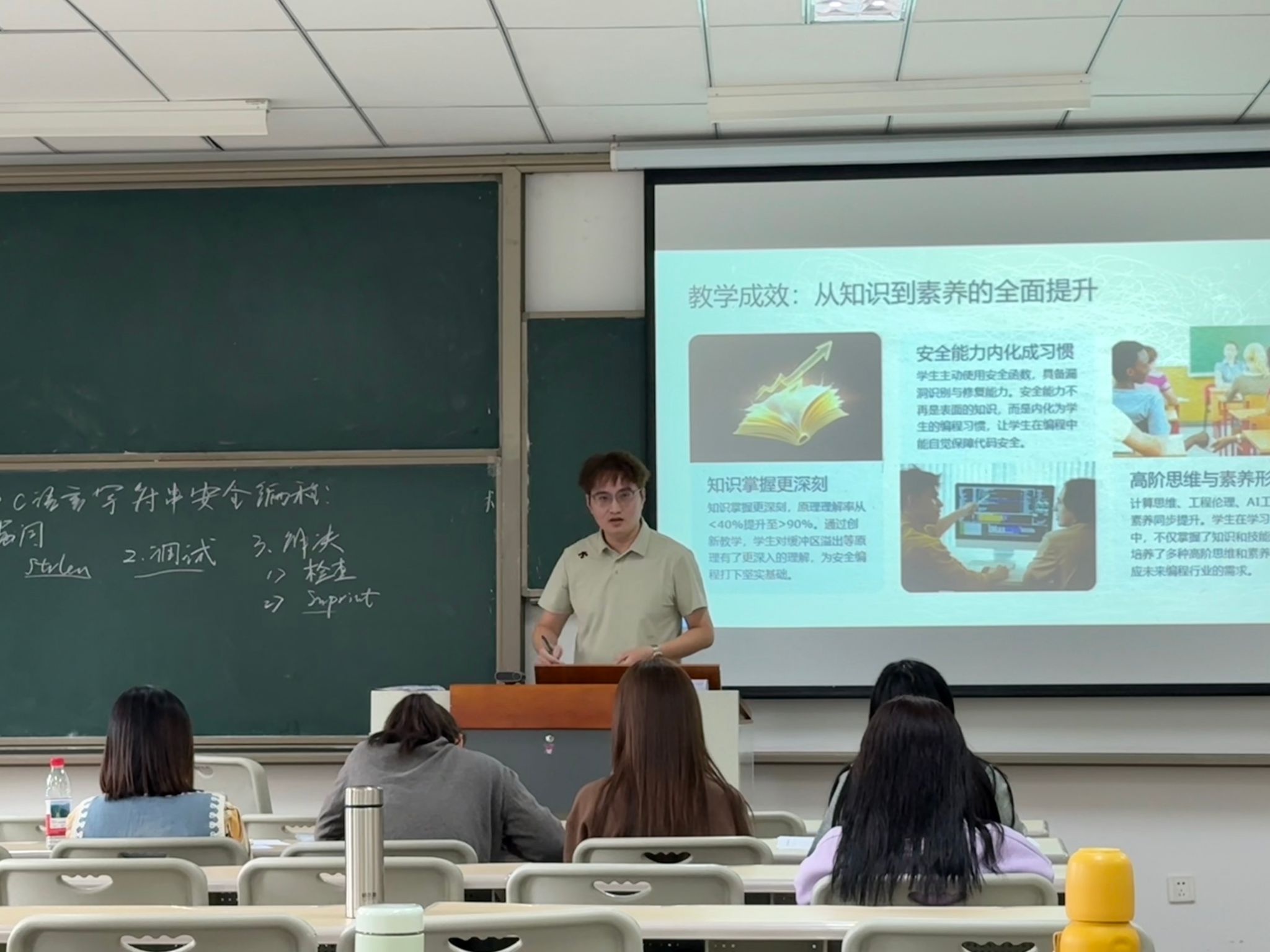课程思政赛道聚焦“立德树人”根本任务,将思政元素与专业知识深度融合,避免空泛说教,实现“以知载道”的育人效果。李璞老师通过实际案例车站信号的可靠性对社会交通的影响,自然融入安全第一、责任担当等思政元素,避免生硬灌输,实现知识传授与价值引领的有机统一。基础课程赛道的黄谨安老师采用“拆解漏洞+分析原理+学习防御”的教学逻辑,从“冲击波病毒利用C语言字符串漏洞攻击系统”这一真实案例切入,分析字符串安全编程的核心原理,引导学生掌握专业技能的同时,树立“技术服务社会、守护网络安全”的责任感。