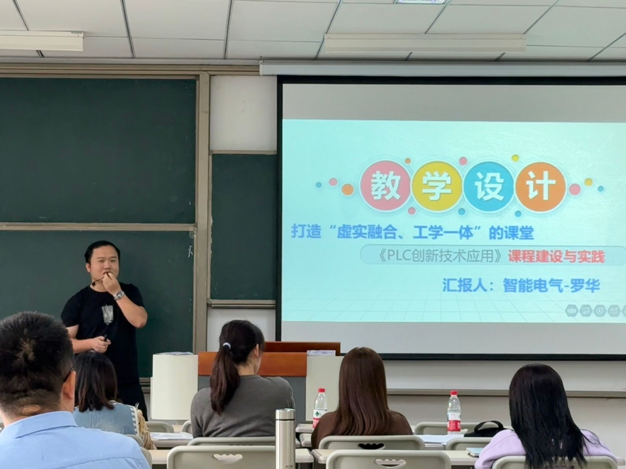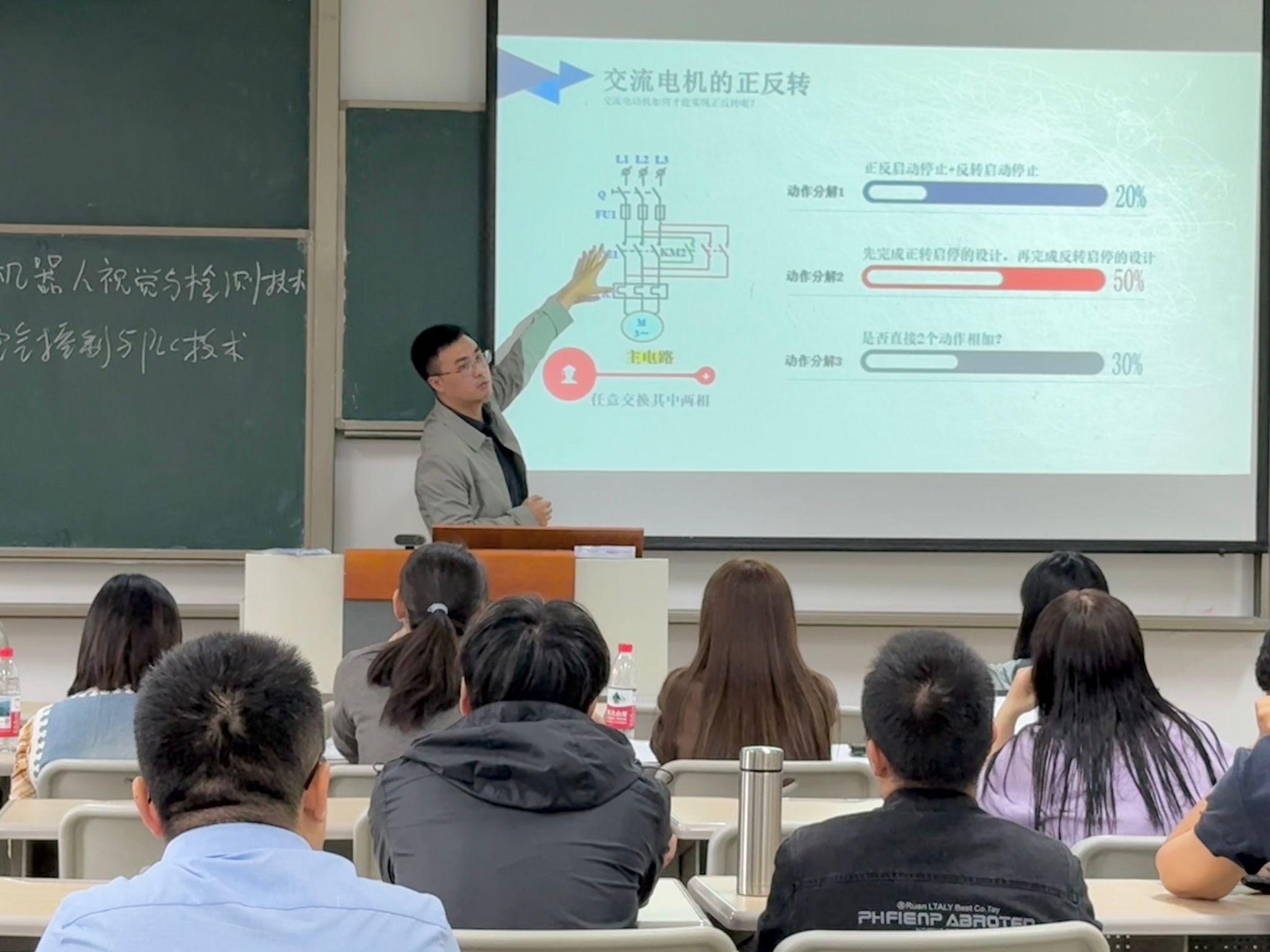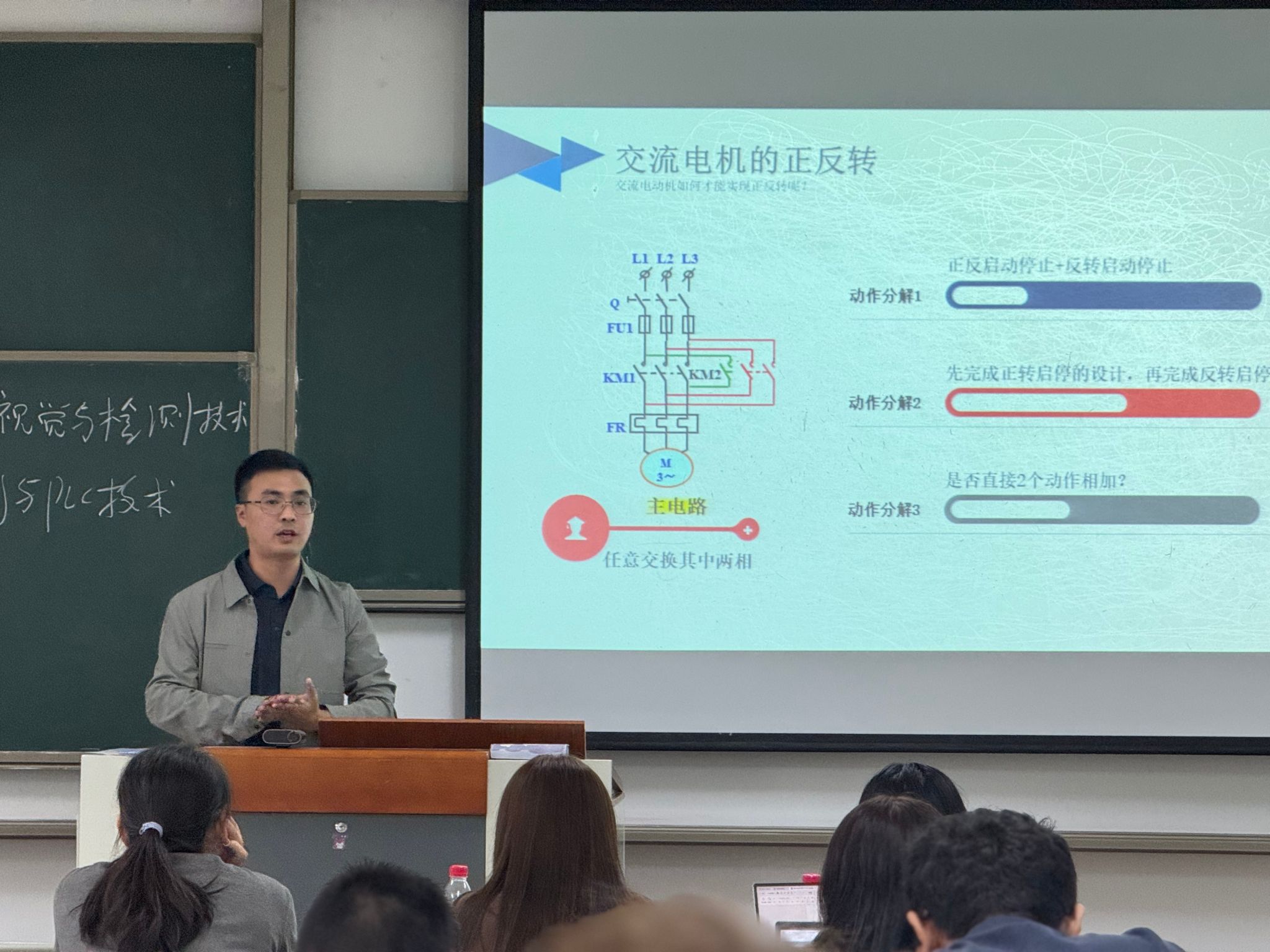 产教融合赛道率先拉开比拼序幕,教师围绕“校企协同育人”核心,将行业实践与课堂教学深度融合。刘佳音老师讲授《机器人视觉与检测技术》时引入实物展示,直观理解技术原理,主张企业工程师参与教学,将企业生产中的检测难题设计教学案例,真正实现“教学做一体化”。陈龙灿老师则将复杂的电气控制回路转化为动画,让抽象的编程逻辑变得清晰易懂,同时融入企业生产中的安全规范与质量标准,强化学生的行业适配能力。