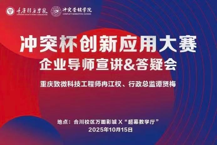 10月15日下午14:00至16:00,在重庆移通学院合川校区万画影城X“超幕教学厅”,成功举办了“冲突杯”创新应用大赛企业导师宣讲与答疑会。本次大赛由重庆移通学院与重庆致微科技有限公司联合主办,旨在推动高校学子在电致变色显示技术领域的创新实践与应用开发。会议由冲突营销学院主管董道进老师主持。