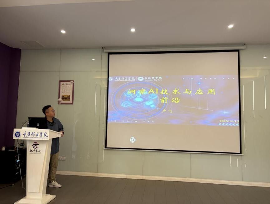 在人工智能技术迅猛发展、深刻重塑产业格局的时代背景下,大数据学院于2025年10月15日下午在观云书院成功举办两场深度关联的专题讲座,分别以“洞察AI技术与应用前沿”与“大学生如何构建面向未来的AI竞争力”为主题。两场讲座均特邀德勤中国人工智能研究院资深数据科学家、高级经理卢飞担任主讲,大数据学院数据科学与大数据技术专业负责人徐琴教授主持专题讲座,吸引了学院各年级师生的广泛参与。