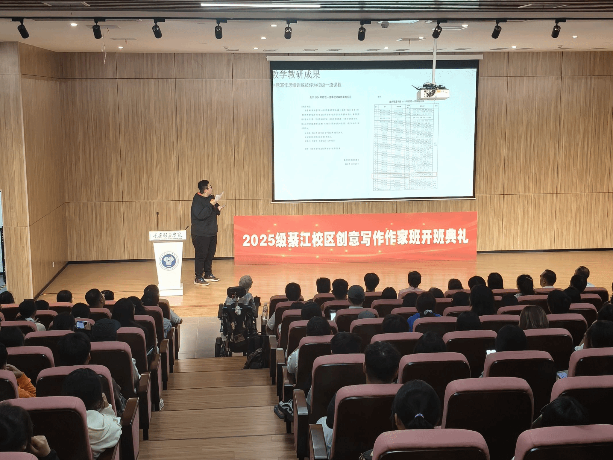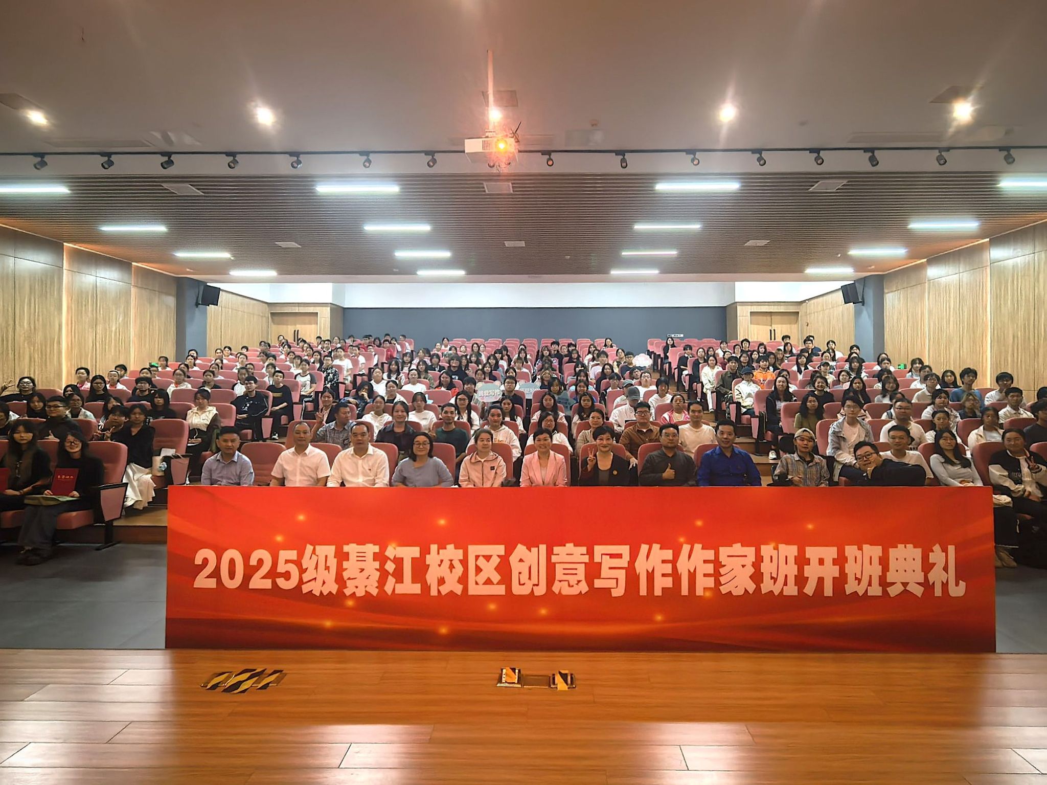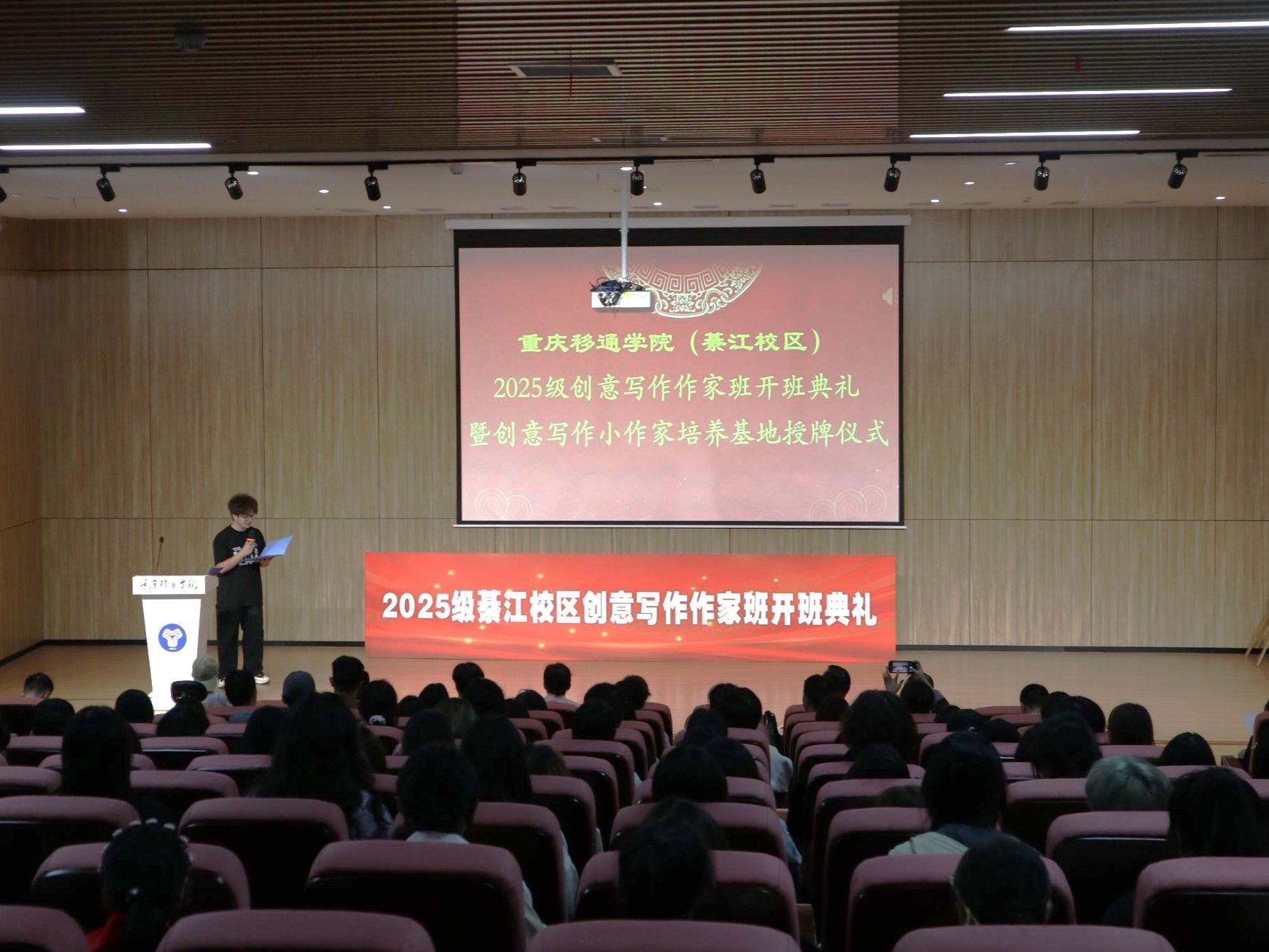 薪火相传,笔墨启航。10月15日下午16时,重庆移通学院綦江校区贤者楼131报告厅内灯火通明、气氛热烈,2025级创意写作作家班开班典礼暨“创意写作小作家培养基地”授牌仪式在此隆重举行。典礼深情送别2024级创意写作作家班学员,见证他们丰硕的学业成果,同时热情迎接2025级新生加入创意写作大家庭,并与綦江区长乐小学携手共建校际合作,举行授牌仪式。此次活动承前启后,凝聚文学薪火,激励新老学员在创作道路上并肩前行,共同开启崭新的文学征程。