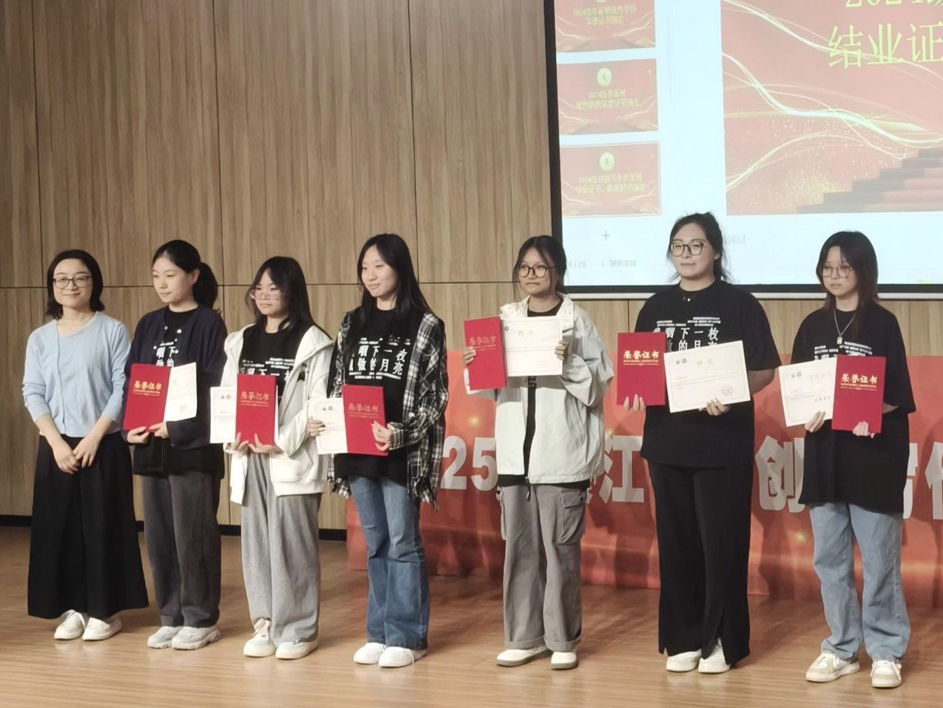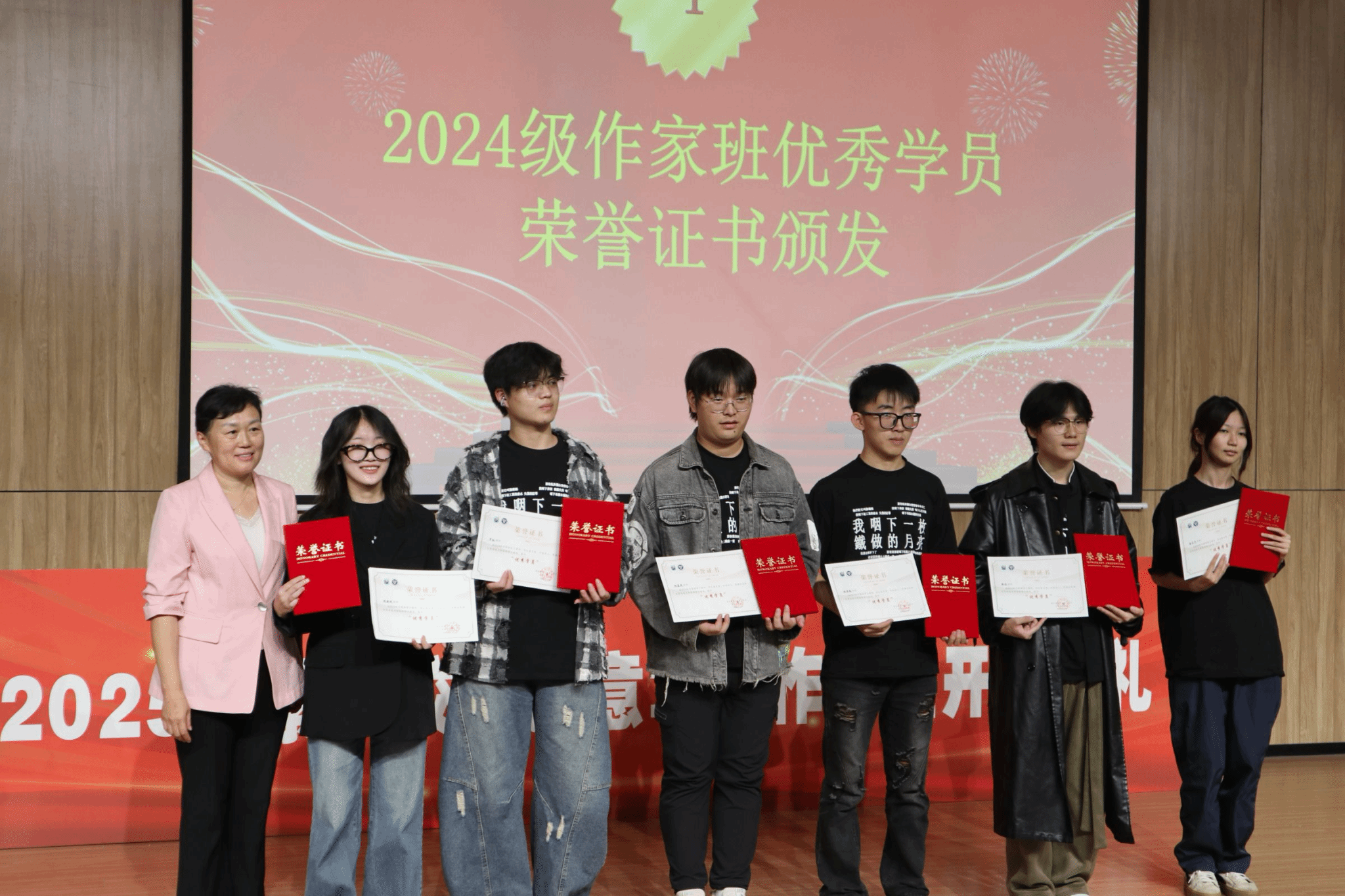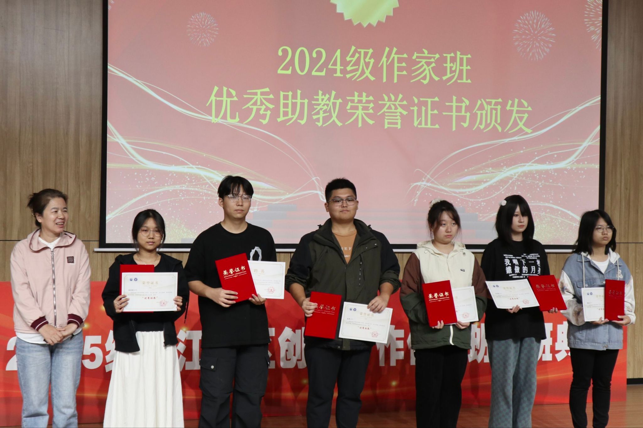 颁奖结束后,典礼迎来庄重的传承环节。在丁一钒老师主持下,2024级作家班全体学员依次上台领取结业证书,为一年的学习画上圆满句点。通识教育学院张艳副院长为2025级作家班新任助教——张子豪、钟彦仪、秦宇婷、龚浩楠、韩彬彬、陈子仪等同学颁发聘书,勉励他们传承责任担当,做好师生沟通的桥梁。