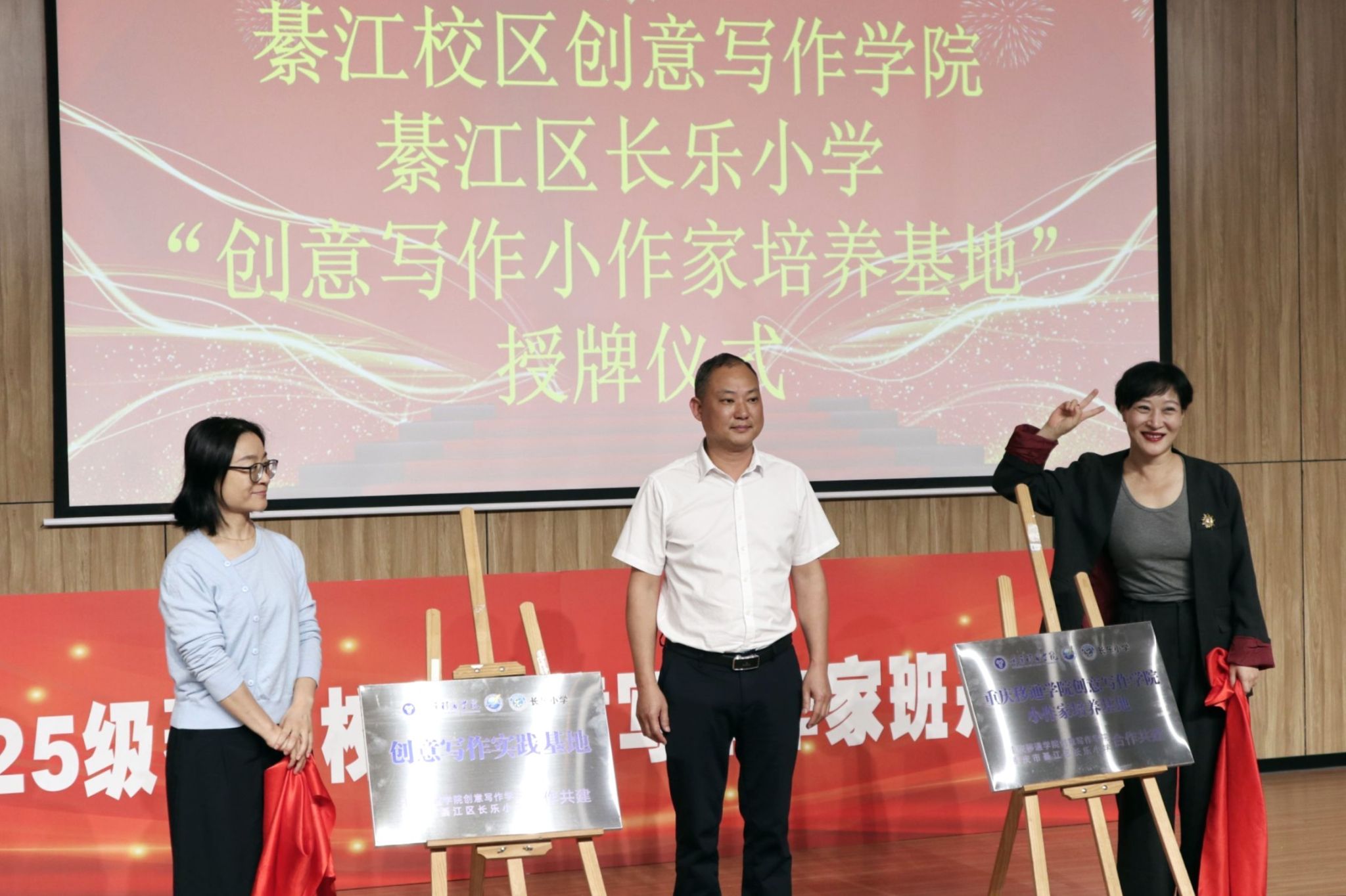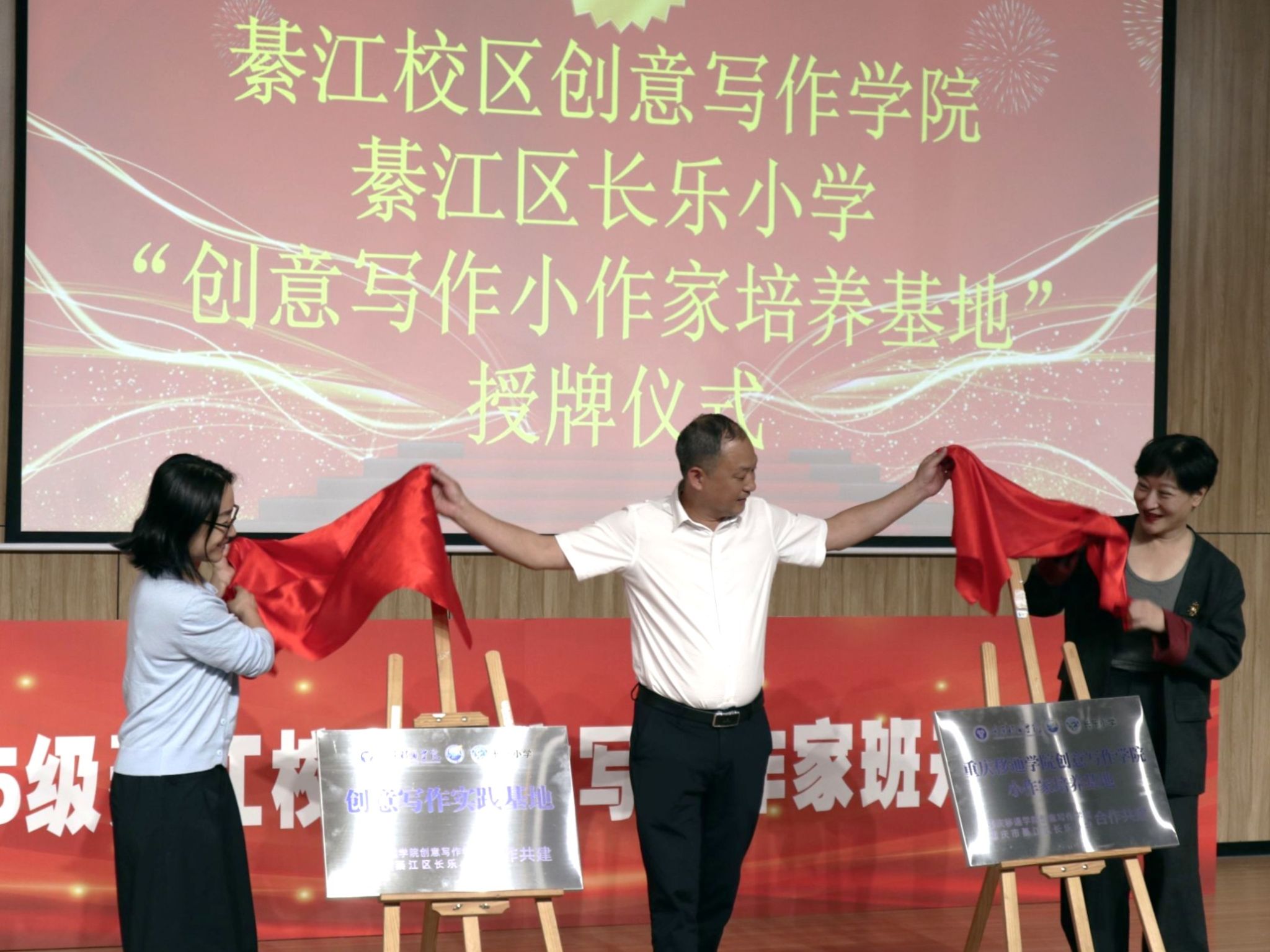 紧接着,典礼迎来又一重要议程——“创意写作小作家培养基地”授牌仪式,标志着创意写作教育继续向基础教育延伸。重庆移通学院创意写作学院与綦江区长乐小学正式缔结合作关系,双方将在课程共建、师资培训、学生交流、资源共享四个方面深度联动。重庆移通学院通识教育学院副院长张艳、创意写作学院副院长郭晶晶,与綦江区长乐小学校长扈晓勇共同登台,完成授牌仪式。