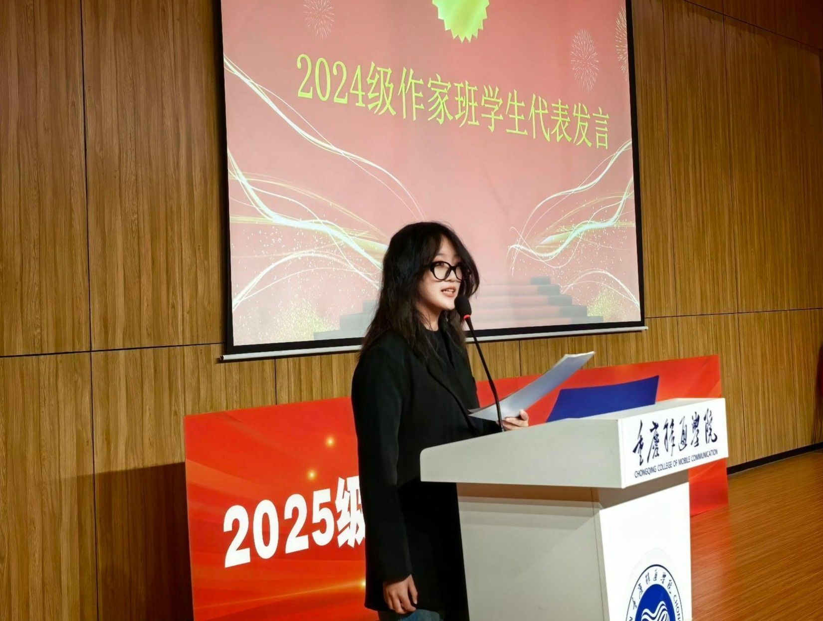 紧接着,2024级作家班小说工坊税安琪同学作为学生代表发言。她深情回忆了一年前初入作家班时的忐忑与憧憬,分享了每周五夜晚在“明亮而温暖”的灯光下,与师友共读经典、打磨作品的珍贵时光。她感慨,在导师们的悉心指导下,她找到了“创意写作中蕴藏的文学灯火”,作品也得以发表于学院官方公众号。“选择作家班,就是选择一群志同道合的伙伴,选择一段被文字温柔包裹的时光,”她动情地说,“愿我们都能记得这盏周五晚上的灯火,带着‘作家班’这个共同的名字,继续用真诚的文字记录点滴,传递温暖。”