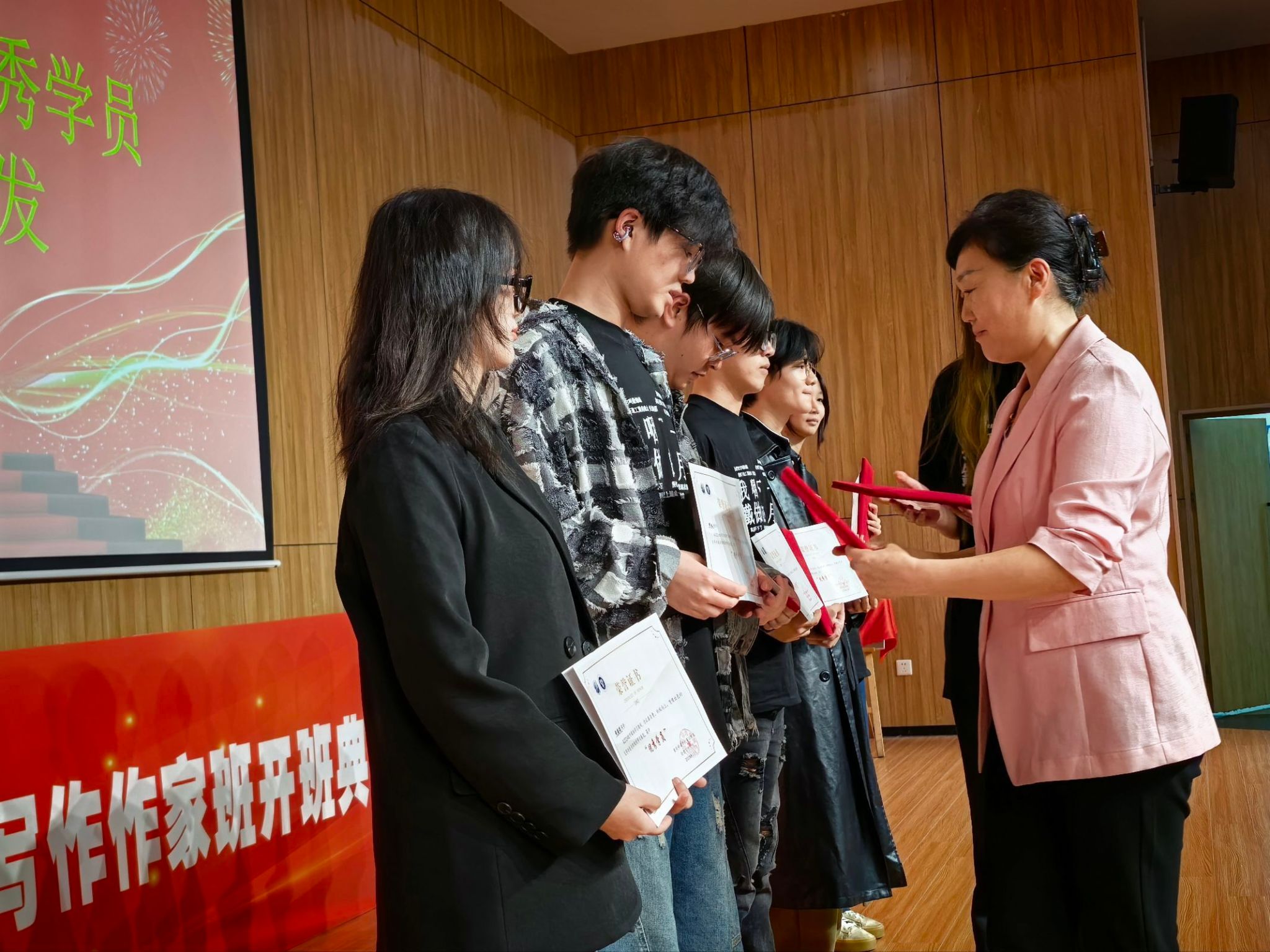 随后进入颁奖环节。诗人张映姝老师为2024级作家班优秀学员颁奖,涵盖六大工坊的税安琪(小说)、罗灿(诗歌)、杨康杰(戏剧)、赵博凯(非虚构)、张浩(新媒体)、康颖(网络文学)等同学获颁荣誉证书。张老师与他们亲切交流,充分肯定其创作潜力。