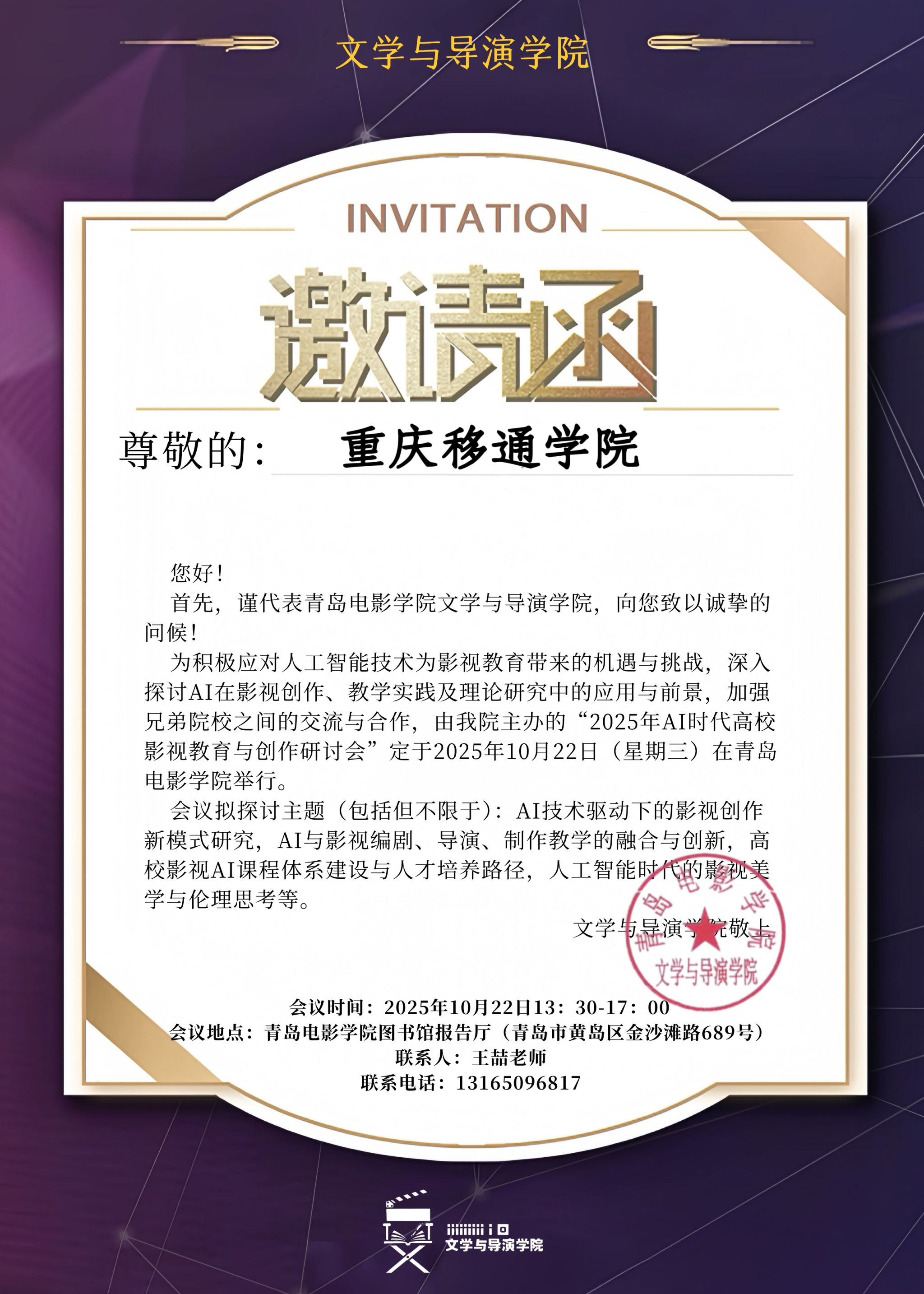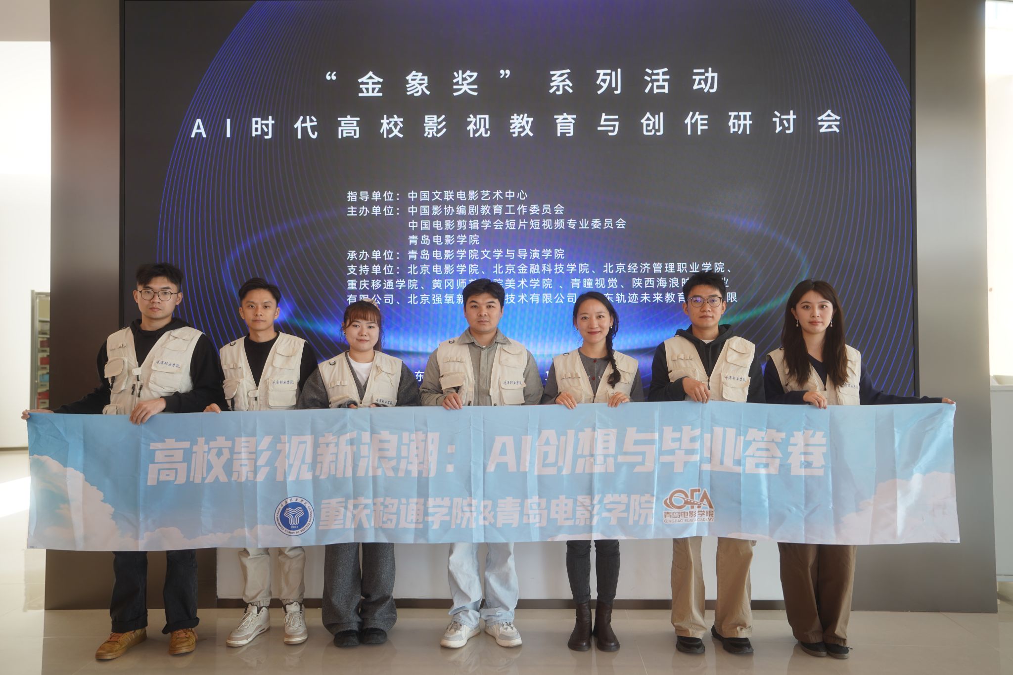 秋意正浓,征程再启。继在平遥国际摄影大展崭露头角后,重庆移通学院的艺术探索步伐迈向更加辽阔的海洋舞台。10月22日应国家级重磅活动邀请,由重庆移通学院艺术传媒学院作为校内承办单位,经过严格的校内选拔与作品打磨,共选送作品12件,深度参与了第一届“金象杯”系列活动——AI时代高校影视教育与创作研讨会。此次高规格的活动,是重庆移通学院在动态影像与前沿技术融合领域的一次集中展示与深度交流,也是育人理念在AIGC时代的又一次深刻实践。此次研讨会由艺术传媒学院教学副院长张梅带队,广播电视编导教研室主任曹洋洋,教师李萌芮、邹伽楠、黄海春、朱智伟、刘影等师生代表前往青岛参加。