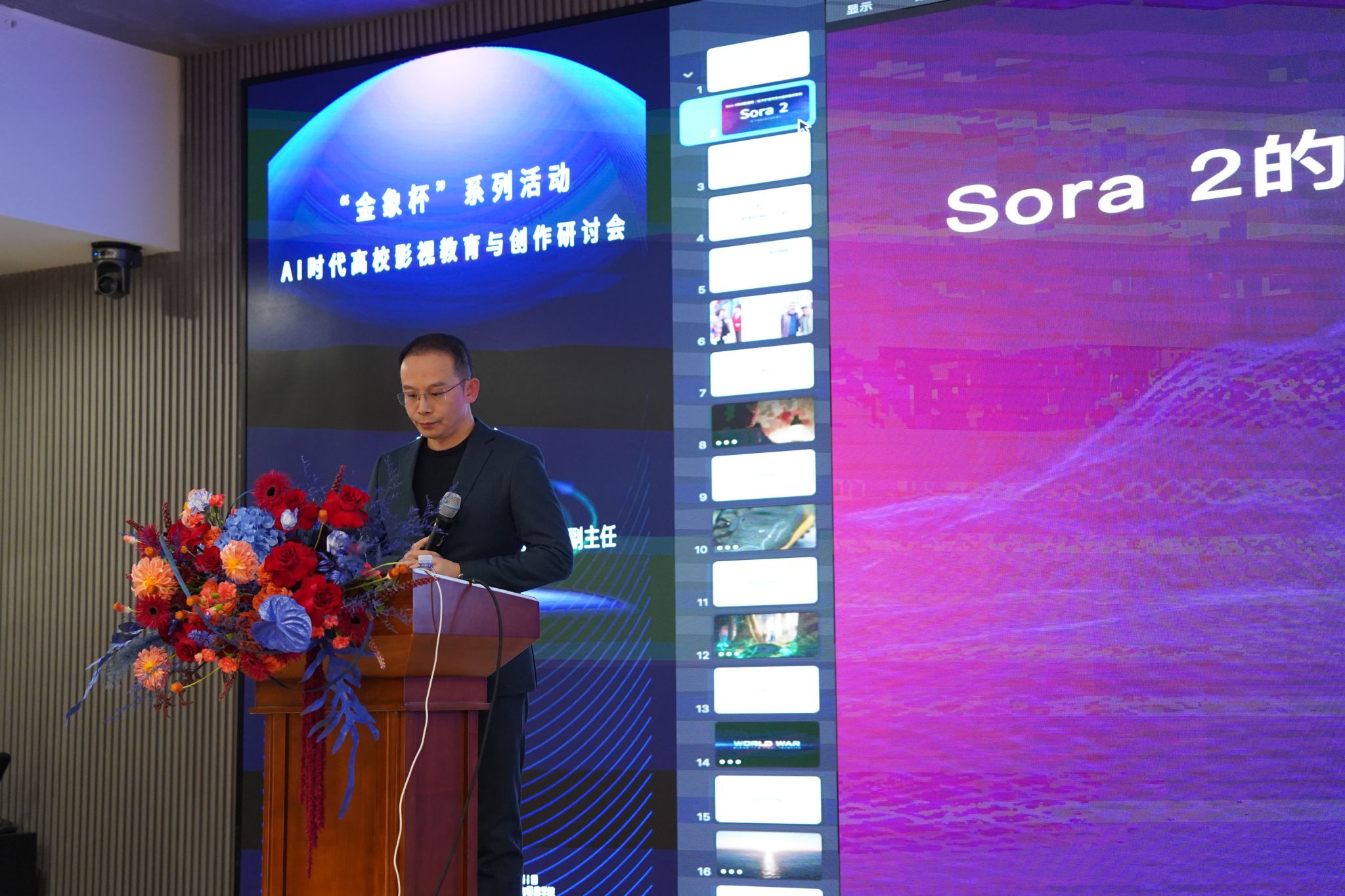 研讨会上,山西传媒学院视听学院院长贾月、中央戏剧学院电影电视系主任高雄杰、中国传媒大学戏剧影视学院导演系主任刑北冽、华南师范大学电影创作研究中心主任甘小二、中国文联电影艺术中心电影创作指导处副处长田园、云南艺术学院电影电视学院常务副院长谢波和青岛电影学院文学与导演学院学科带头人朱昱东就如何将AIGC技术全面融入课程体系与教学方法,重构从剧本到制作的创作流程,以培养能驾驭新技术的新型影视人才进行了深入探讨。中国电影剪辑学会理事楚利彬与北京生数科技首席执行CEO骆怡航做AI技术发展专题演讲,指出Sora2、Vidu等AI技术已能支持高质量短片创作,正彻底重塑短片生产流程并大幅降低门槛。他们预见,技术的普及将催生以创意和叙事能力为核心的“超级个体”创作者,推动影视教育与实践迈向“人机协同”的新范式。