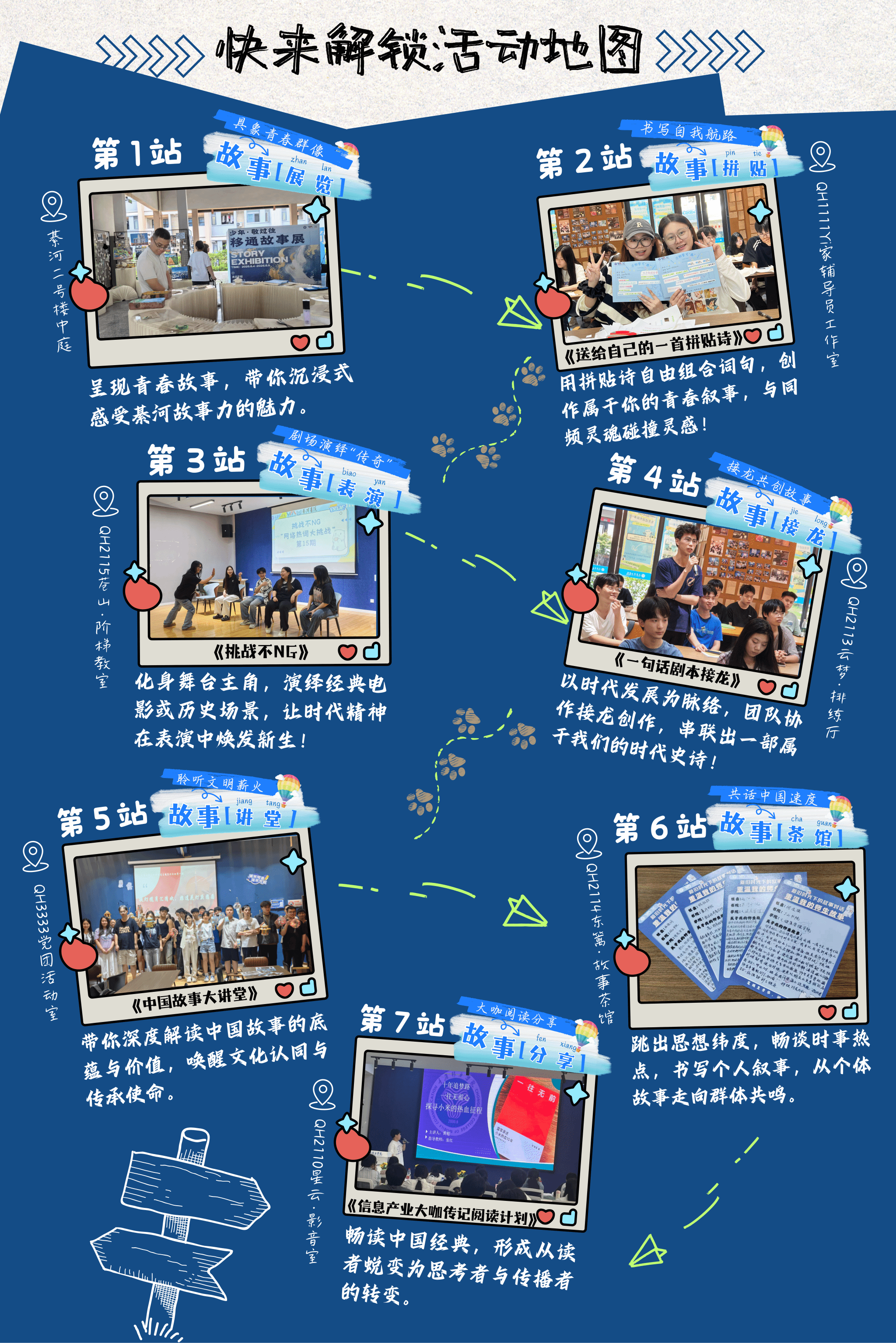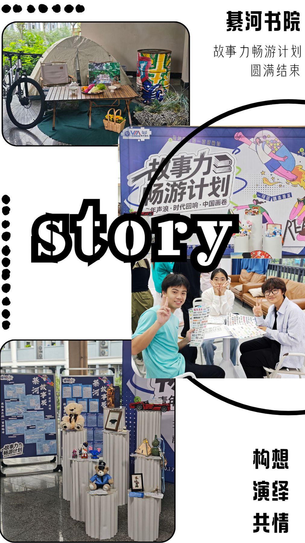 本次“故事力畅游计划”依托书院“故事力成长体系”,精心策划了故事展览、拼贴诗创作、剧场表演、剧本接龙、中国故事讲堂、故事茶馆、大咖阅读分享七大子活动,构建起“感知—理解—表达—共创”的育人闭环。活动从青年自我认知出发,以故事为情感纽带,引导学生从“聆听者”逐步成长为“解读者”“共创者”与“讲述者”,实现从个体情感到集体共鸣的升华,充分彰显书院“环境育人、实践育人、文化育人”的教育理念。