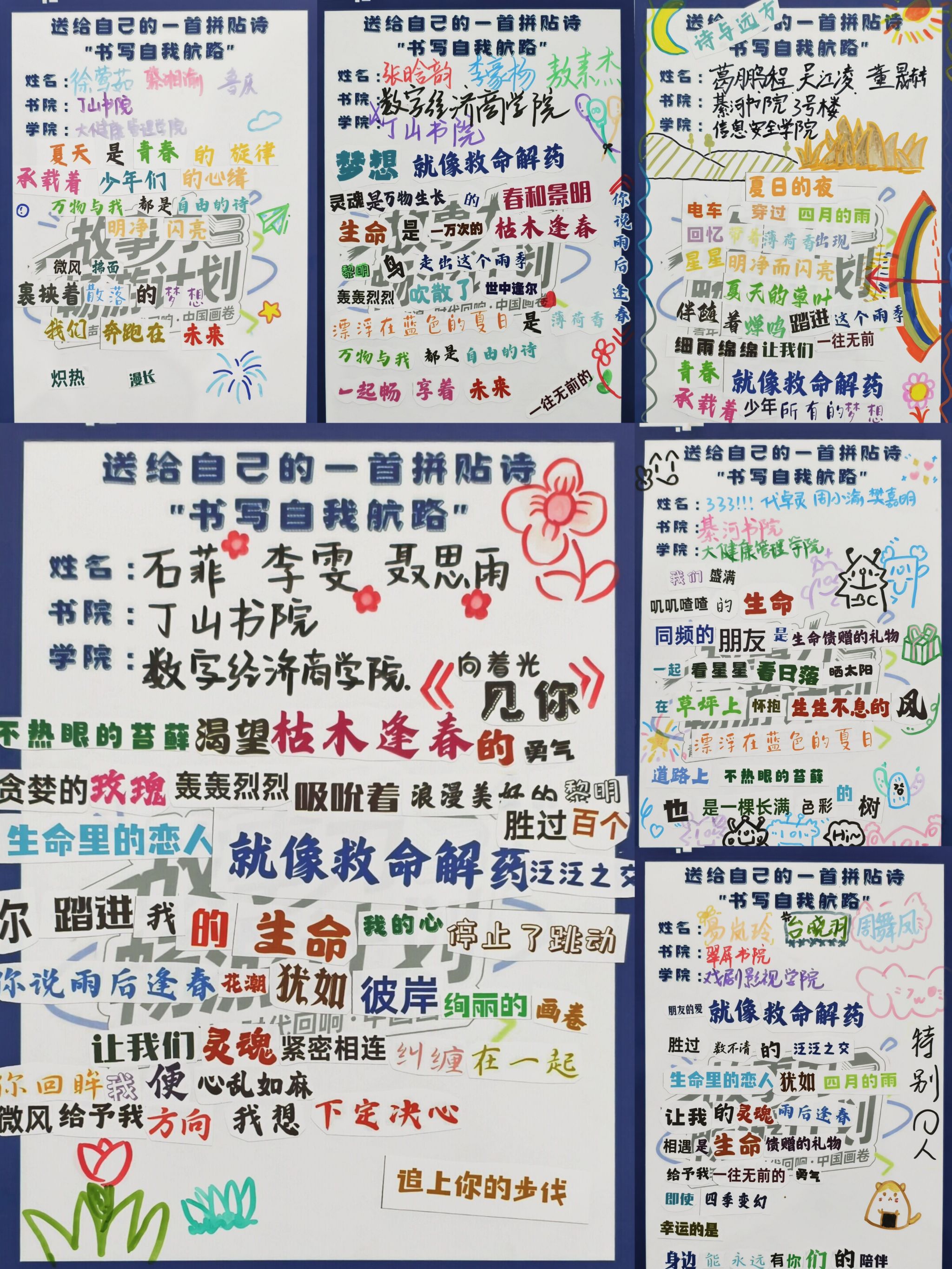 17日下午16:00,六大故事力活动联动开启,在綦河书院构建出一个多维、沉浸的叙事体验空间。Yi家辅导员工作室中,“送给自己的一首拼贴诗”活动正温情展开,同学们从“梦想”“奋斗”“青春”等主题词句中自由选取素材,拼贴出属于自己的人生诗篇。在创作与分享中,青年学子以诗言志、以情动人,在自我表达中构筑精神坐标,汇聚成属于新时代的“青年声浪”。