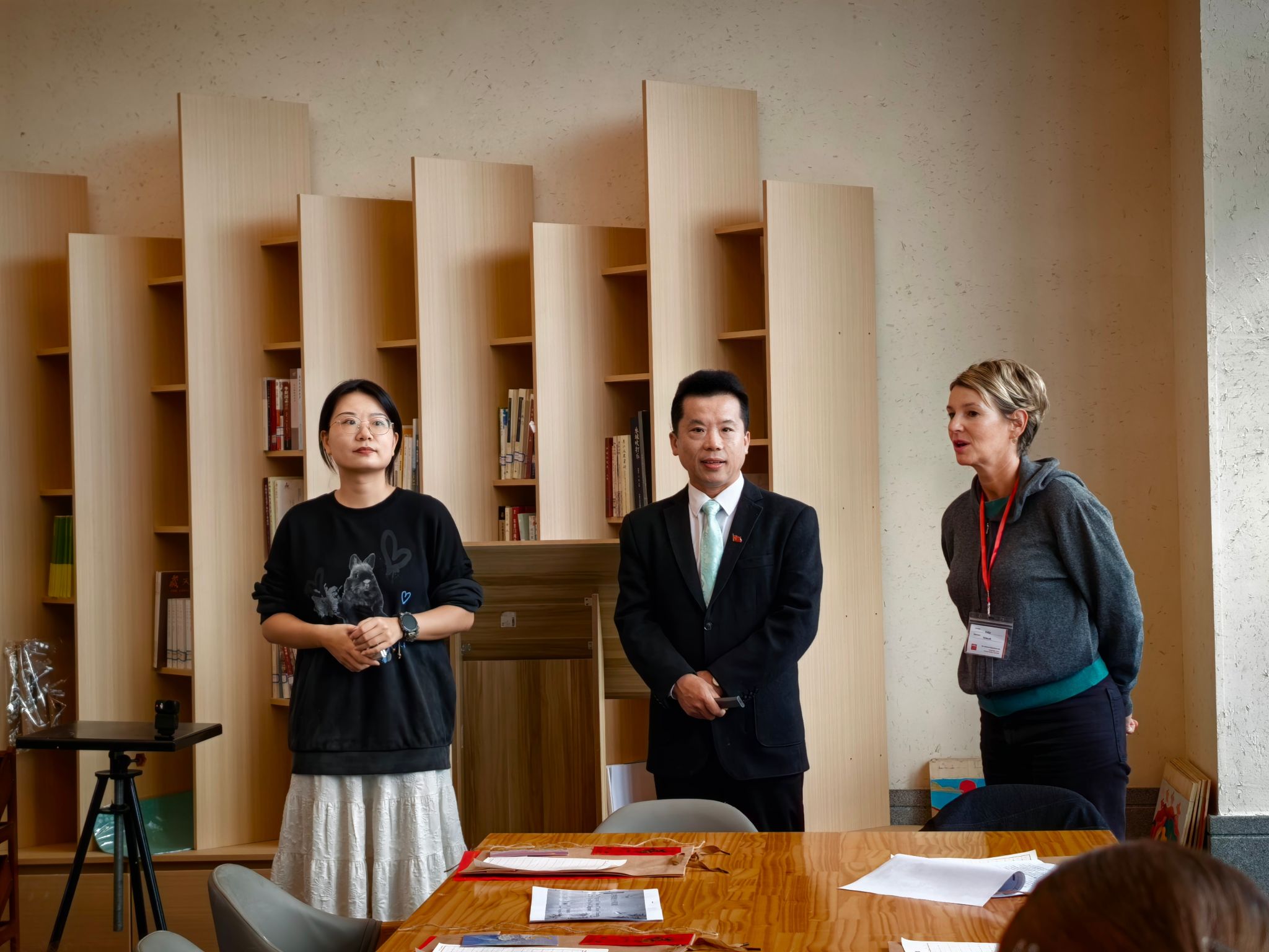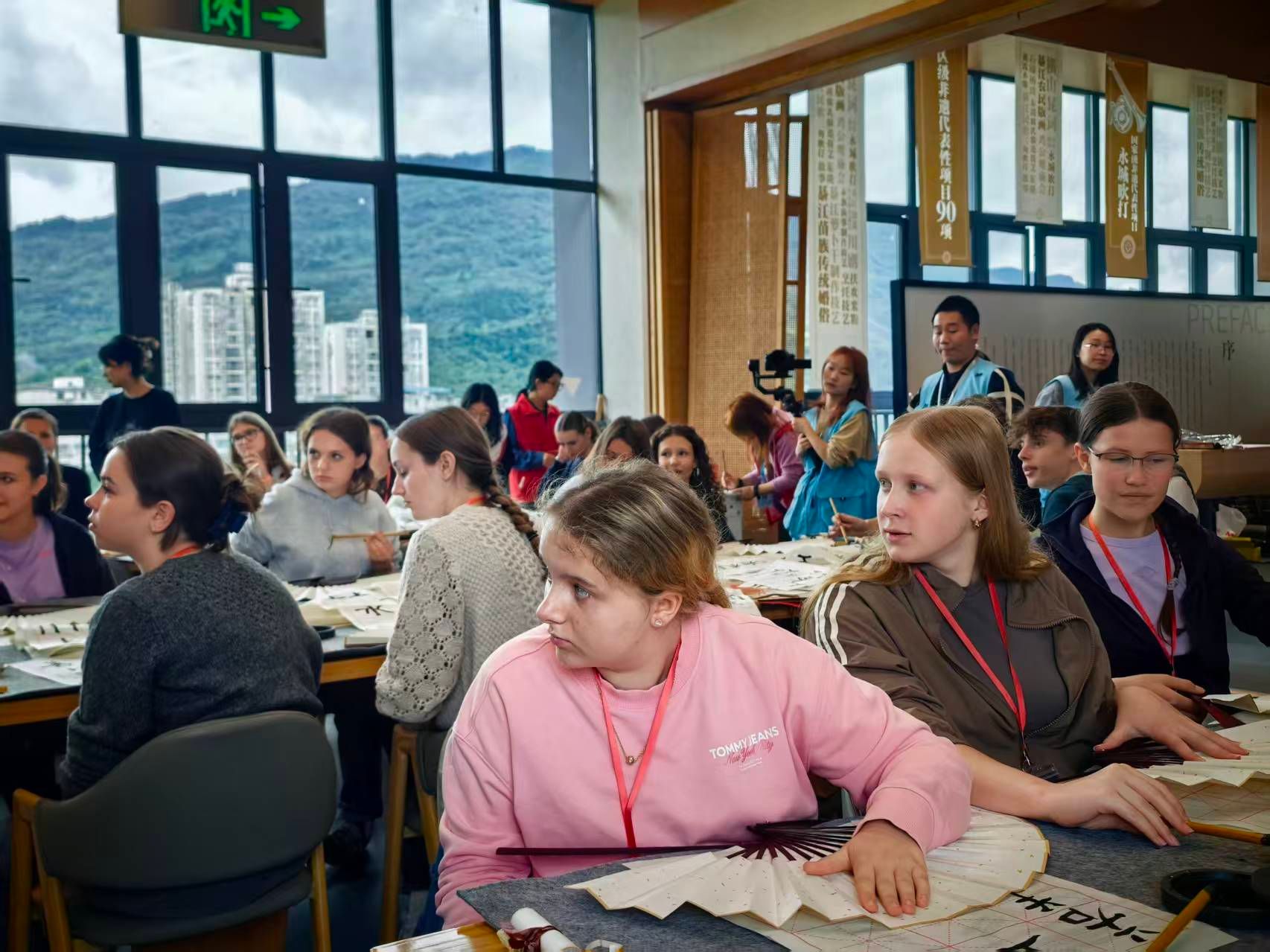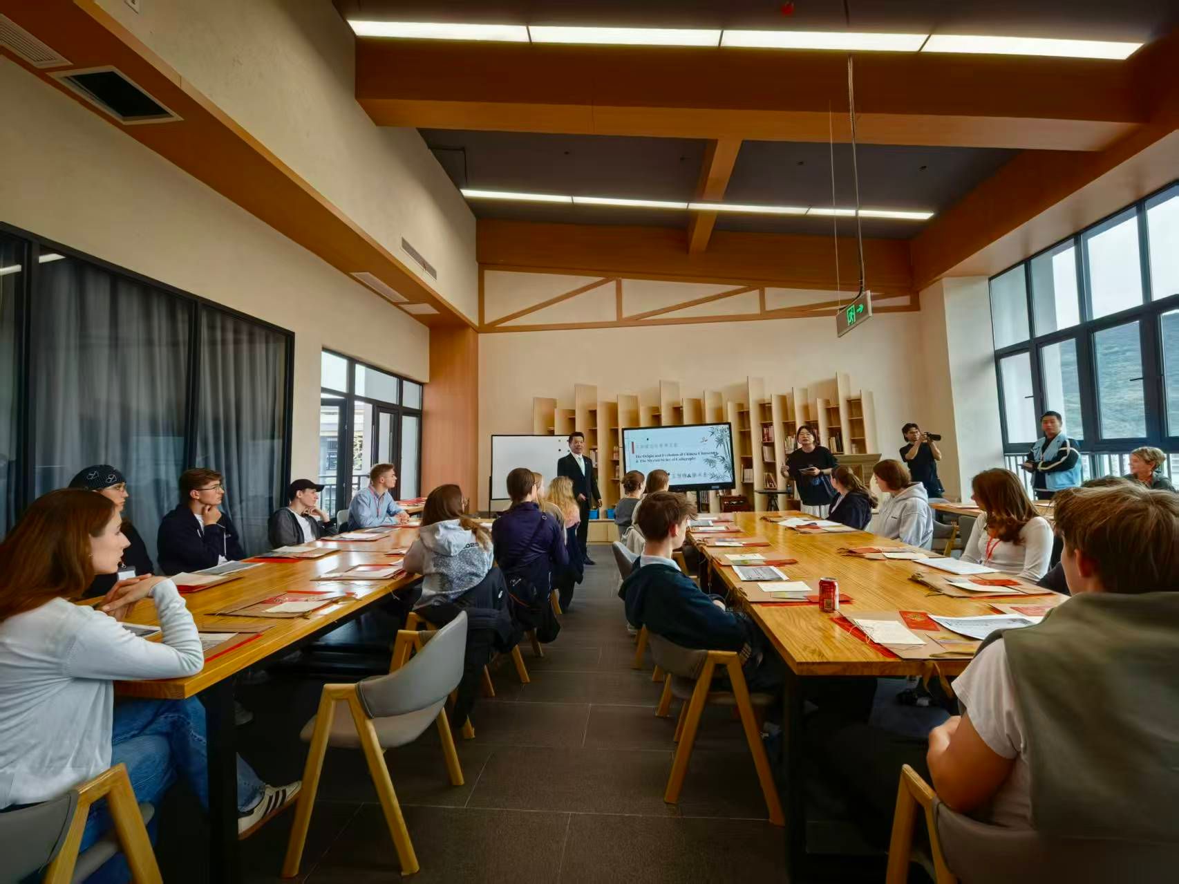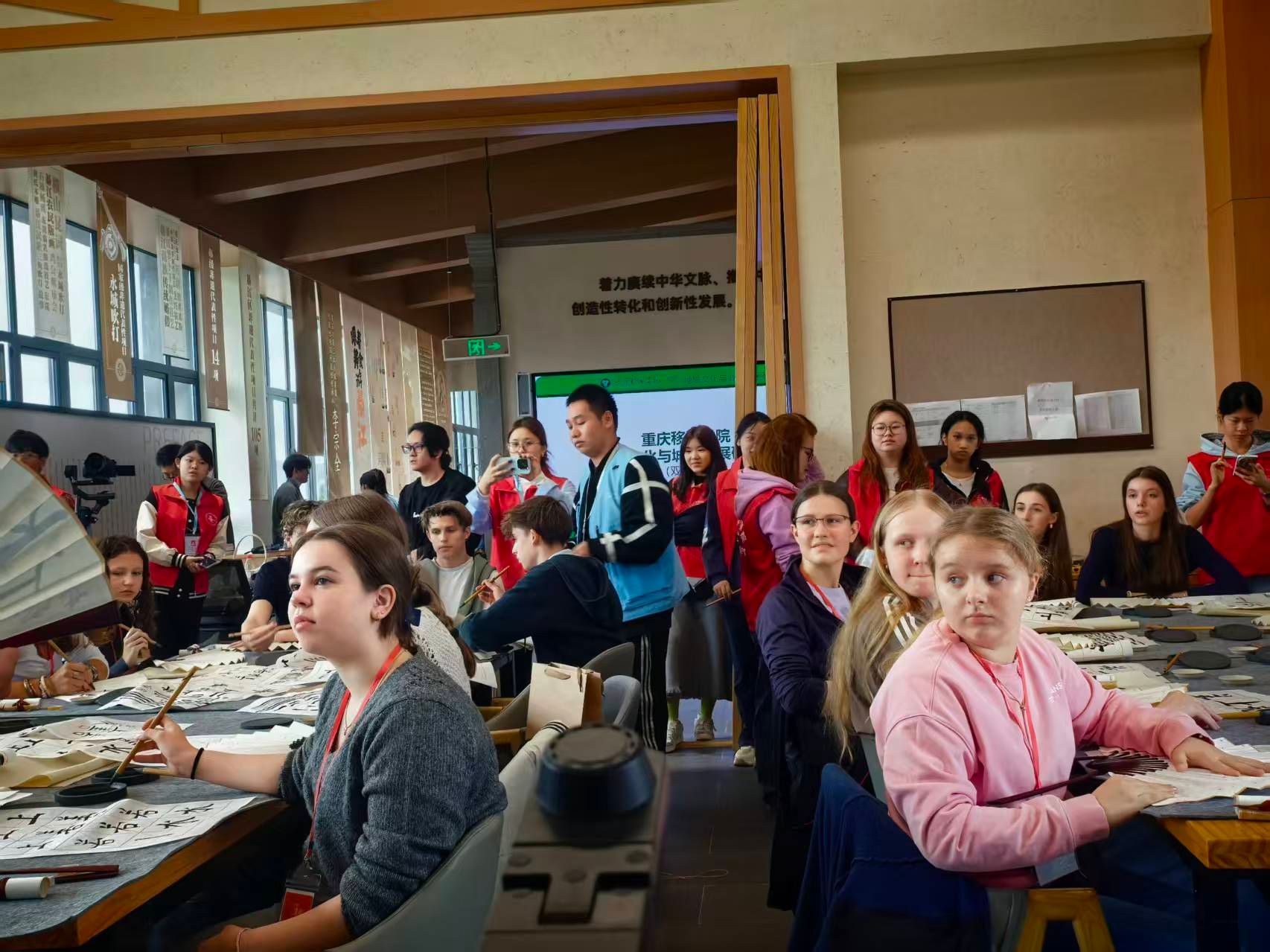 10月21日上午9时,重庆移通学院綦江校区非遗馆三楼教室内掌声阵阵,来自德国AGS公益集团组织的高中研学团三十余名师生,正全神贯注地倾听《汉字源流与书风万象》中华文化课。这堂由学校指定、并由该校创意写作学院精心策划的特别双师课,以汉字为纽带,将中华五千年文明的厚重与璀璨,化作生动有趣的沉浸式体验,让远道而来的德国师生超越时空,感受到了中华文明的独特魅力,友谊也跨越了山海。