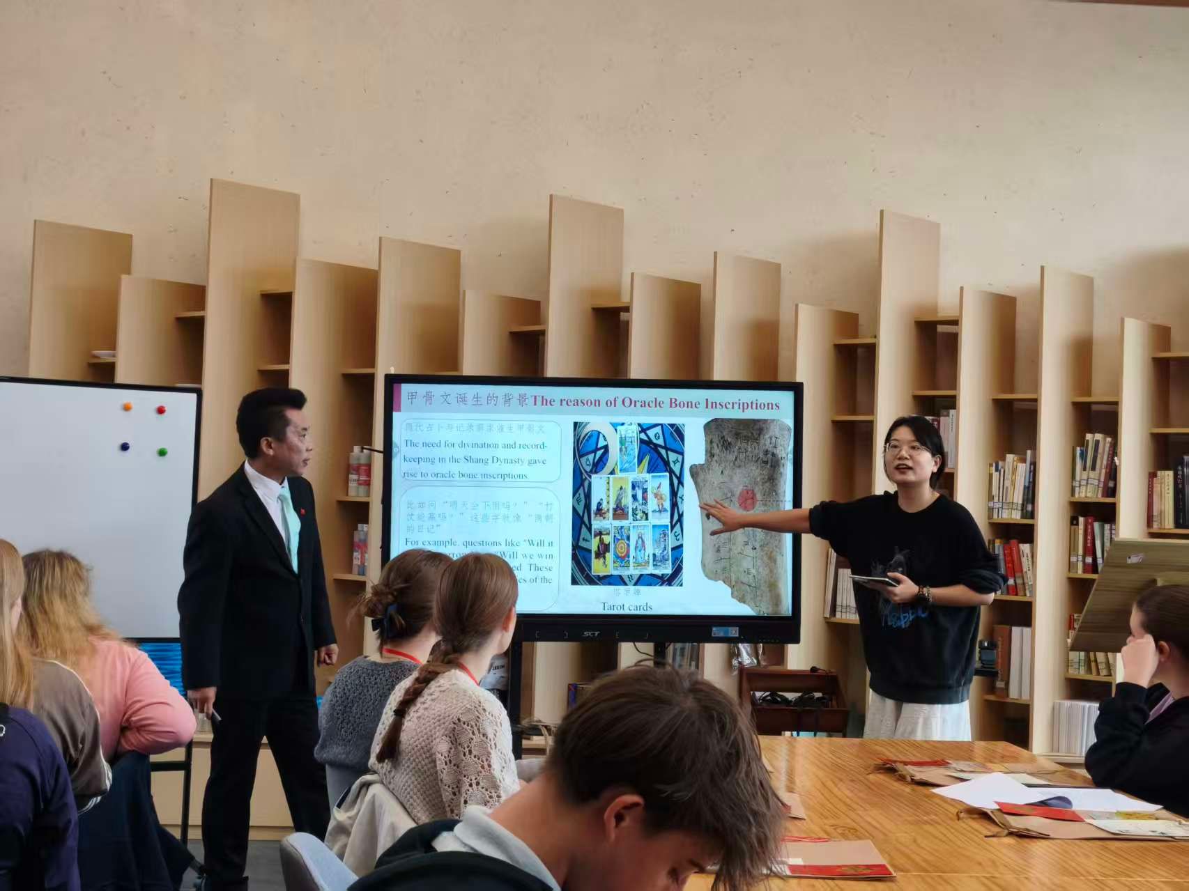德国学生听得入神,一名男生举手提问:“这些文字是刻在龟甲上的吗?古人为什么要这样做?”王恒绩老师都做了详细解答,这也是德国学生触摸到了最早的中华文明,充分感受到了文明古国的历史深度。