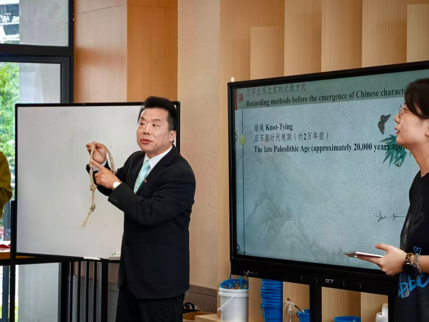 课程从两万年前的“结绳记事”缓缓展开。王恒绩老师手持仿制的绳结道具,结合北京周口店山顶洞人骨针与饰品的文物图片,向师生们讲述旧石器时代晚期人类如何用“大事打大结、小事打小结”的方式记录生活。“这是汉字诞生前最原始的‘信息编码’,为后来的文字创造奠定了思维基础。”随着徐冰玉老师同步翻译,德国学生们纷纷凑上前观察绳结的细节,有的还试着模仿打结的动作。