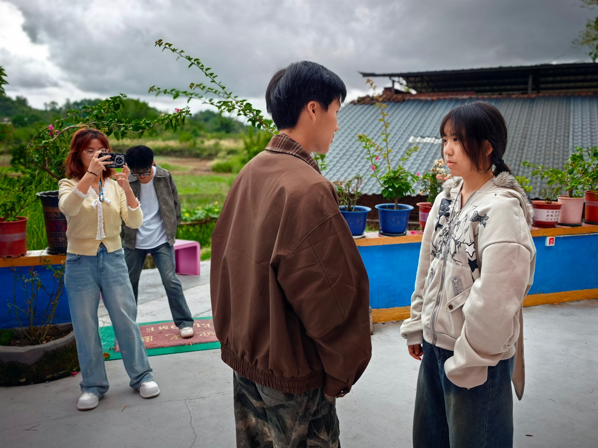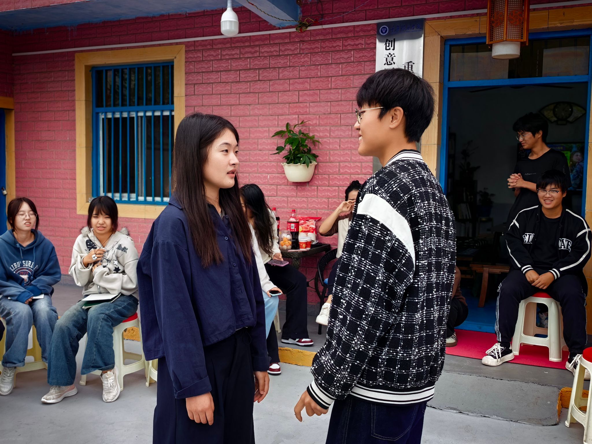 各组依次演绎时,小院里的气氛达到高潮。有的组加入肢体动作,男生挺直脊背敬军礼,女生强忍泪水却攥紧衣角;有的组则用低沉的语气,将“等战争结束,我们就办一场最隆重的婚礼”的约定,说得既心酸又充满希望。其中,学员陈慕涵与扶梦悦的演绎格外动人——男生饰演的士兵即将奔赴前线,女生饰演的恋人没有哭哭啼啼,而是笑着说:“我给你缝了件新棉衣,里面絮的是去年的芦花,跟你老家的一样暖。要是想我了,就摸一摸棉衣,像我在给你捂手。”话音刚落,小院里便响起雷鸣般的掌声,王老师说,这台词太戳人了,没有直白的伤感,却把牵挂藏在每一个细节里。接着,王杨与徐才金,李青宇与傅永丹,谭祖梦与陈春竹,刘钰与孙俊豪,依次上场,让师生们好好过了一把眼瘾。