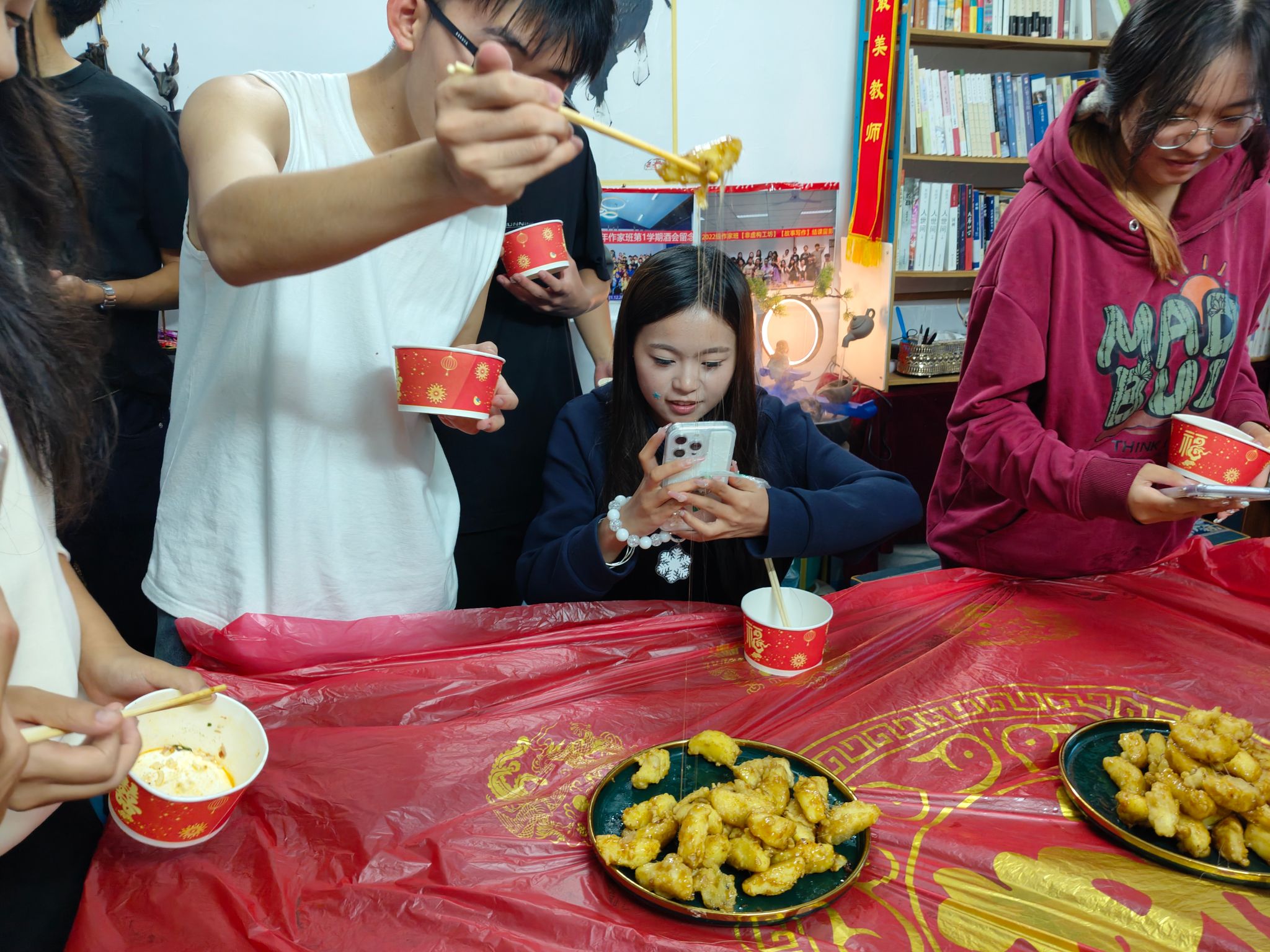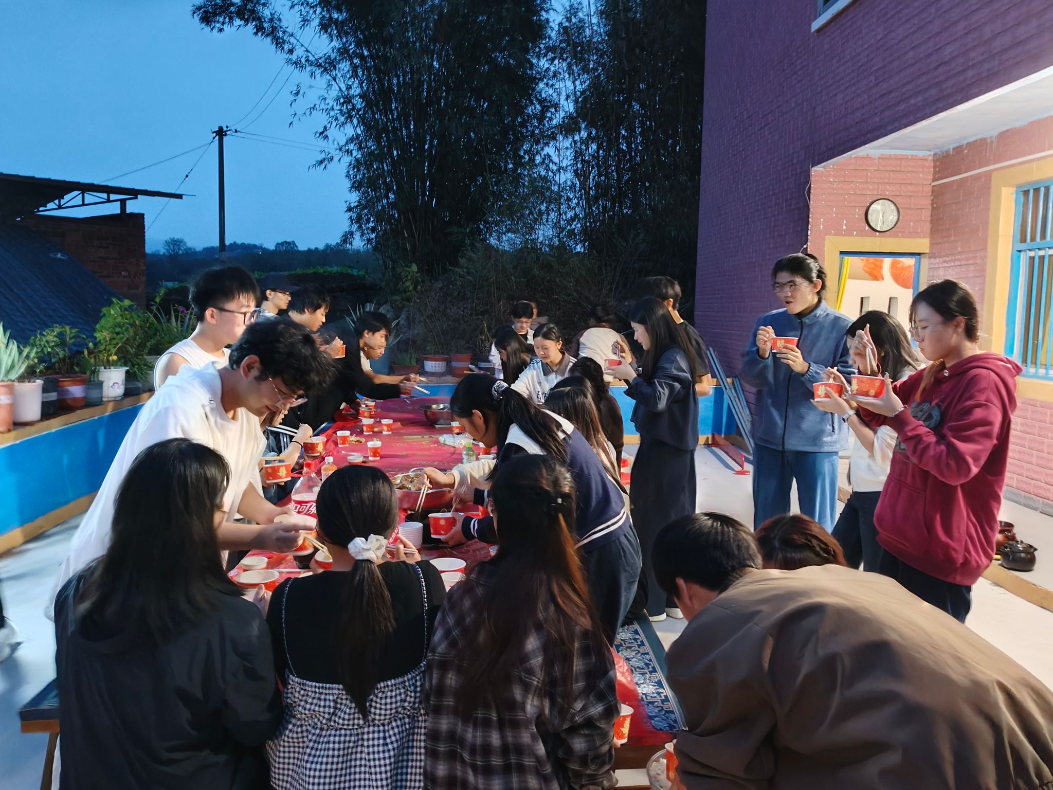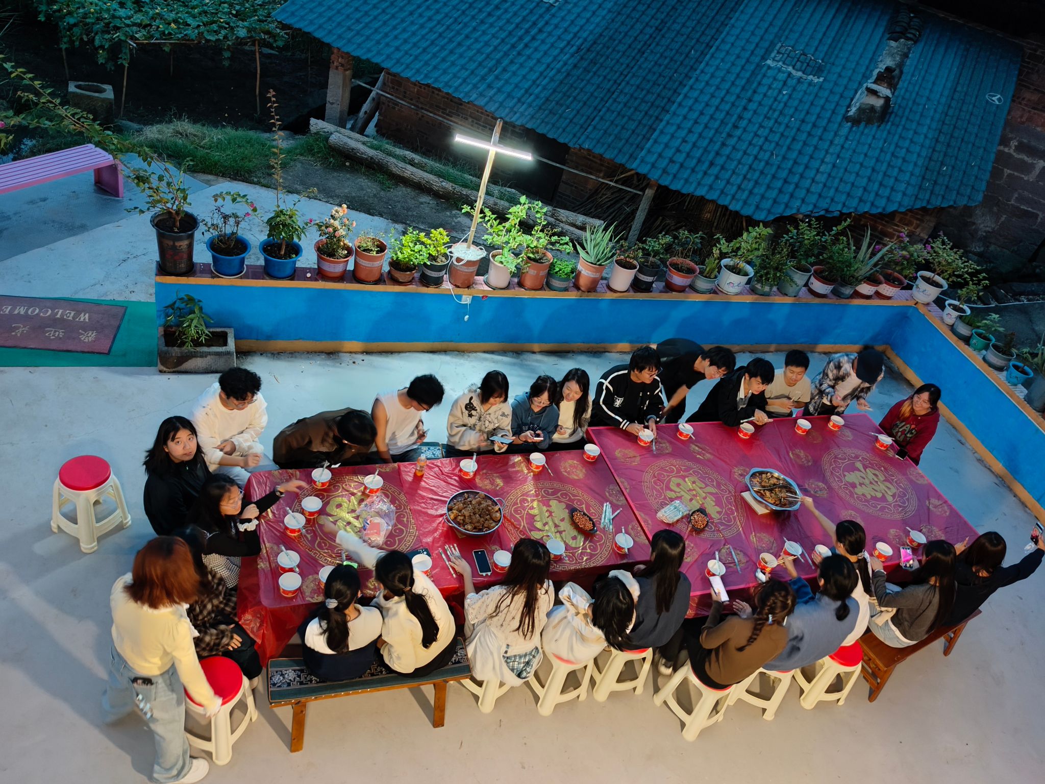课程结束时,天色已暗。王恒绩老师早已为师生们准备了丰盛的晚餐,院子里支起几张大桌,热气腾腾的红烧肉、猪蹄火锅、炖鸡汤、拔丝苹果摆满桌面,大盆的蛋炒饭冒着香气。“大家学习了一下午,肯定饿了!今天咱们就是一家人,热热闹闹吃顿饭!”王老师热情地招呼着大家,师生们围坐在一起,一边吃肉喝汤,一边继续聊着课堂上的创作,聊《乡愁》里的家国情怀,聊着田野里的农家夜色有多美。夜色更深了,小院里的灯光温暖明亮,欢声笑语与饭菜的香气交织在一起,成为这堂田野课堂最温馨的收尾。