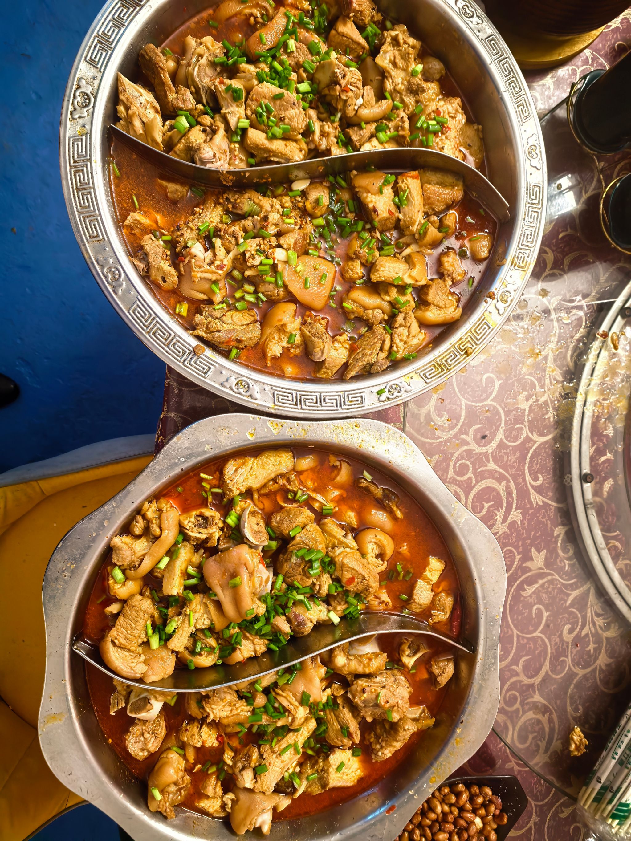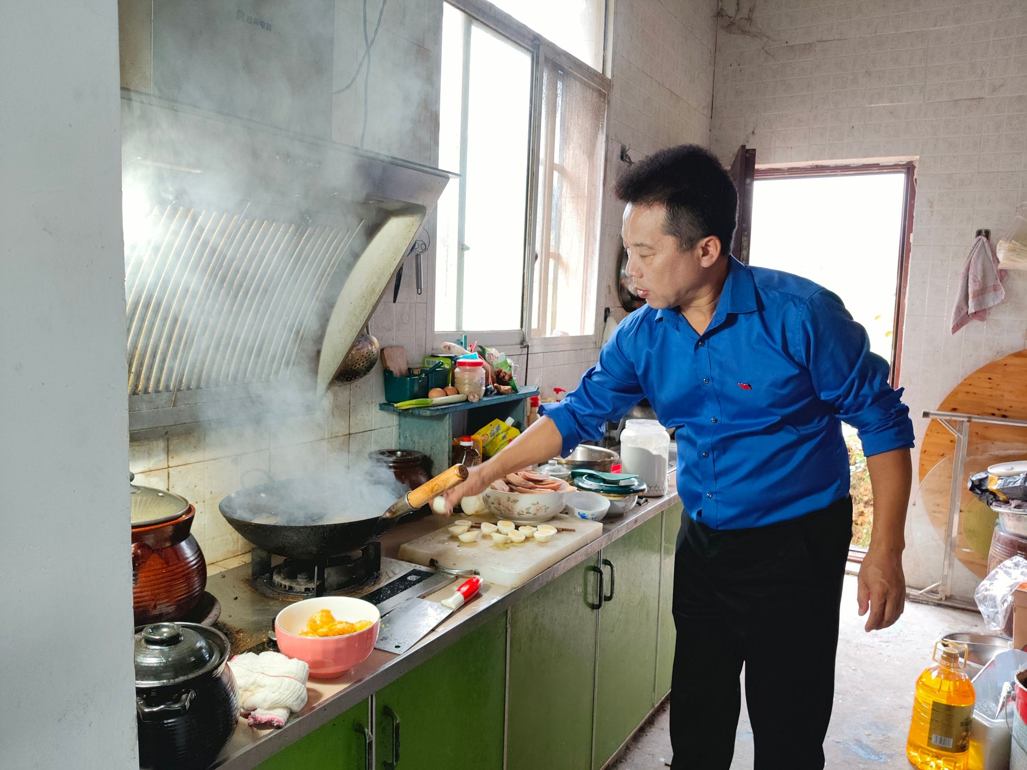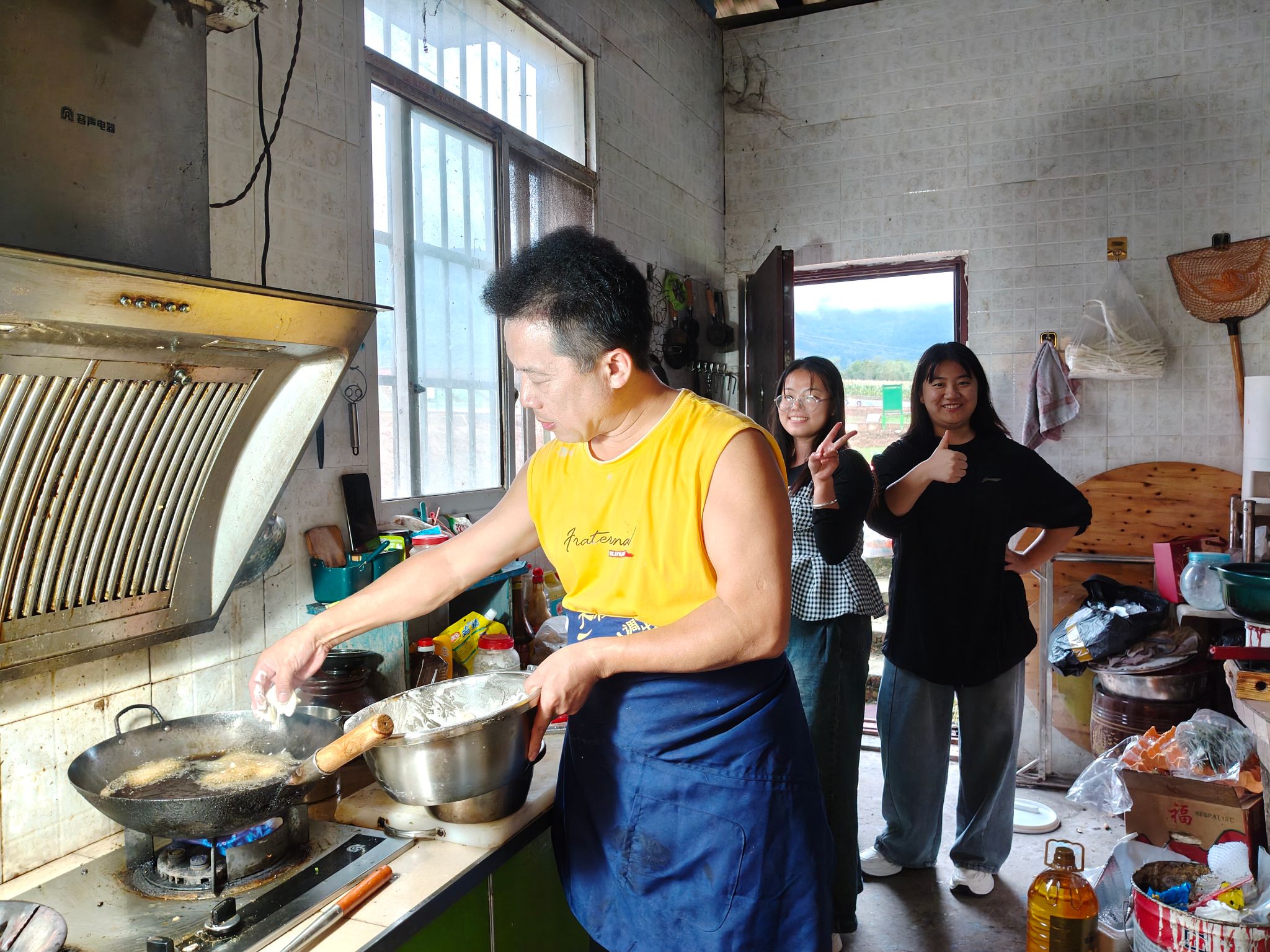 课程结束时,天色已暗。王恒绩老师早已为师生们准备了丰盛的晚餐,院子里支起几张大桌,热气腾腾的红烧肉、猪蹄火锅、炖鸡汤、拔丝苹果摆满桌面,大盆的蛋炒饭冒着香气。“大家学习了一下午,肯定饿了!今天咱们就是一家人,热热闹闹吃顿饭!”王老师热情地招呼着大家,师生们围坐在一起,一边吃肉喝汤,一边继续聊着课堂上的创作,聊《乡愁》里的家国情怀,聊着田野里的农家夜色有多美。夜色更深了,小院里的灯光温暖明亮,欢声笑语与饭菜的香气交织在一起,成为这堂田野课堂最温馨的收尾。