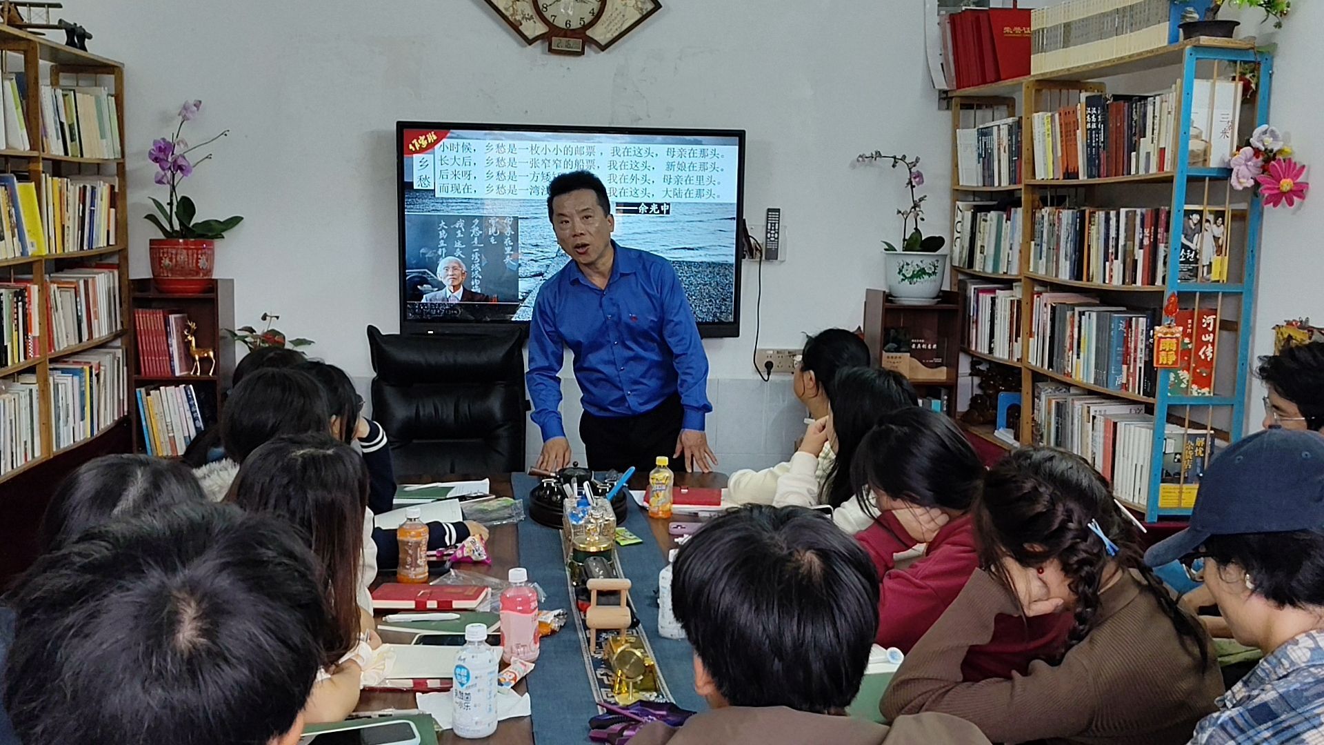 随后,王恒绩老师话锋一转,从“离别”谈到“乡愁”,“战场上的离别,是小家的牵挂;而海峡两岸的分离,是大家的乡愁。有一位诗人,用短短几行诗,写尽了这种牵挂与期盼。”说着,他缓缓朗诵起余光中的《乡愁》:“小时候,乡愁是一枚小小的邮票,我在这头,母亲在那头……而现在,乡愁是一湾浅浅的海峡,我在这头,大陆在那头。”