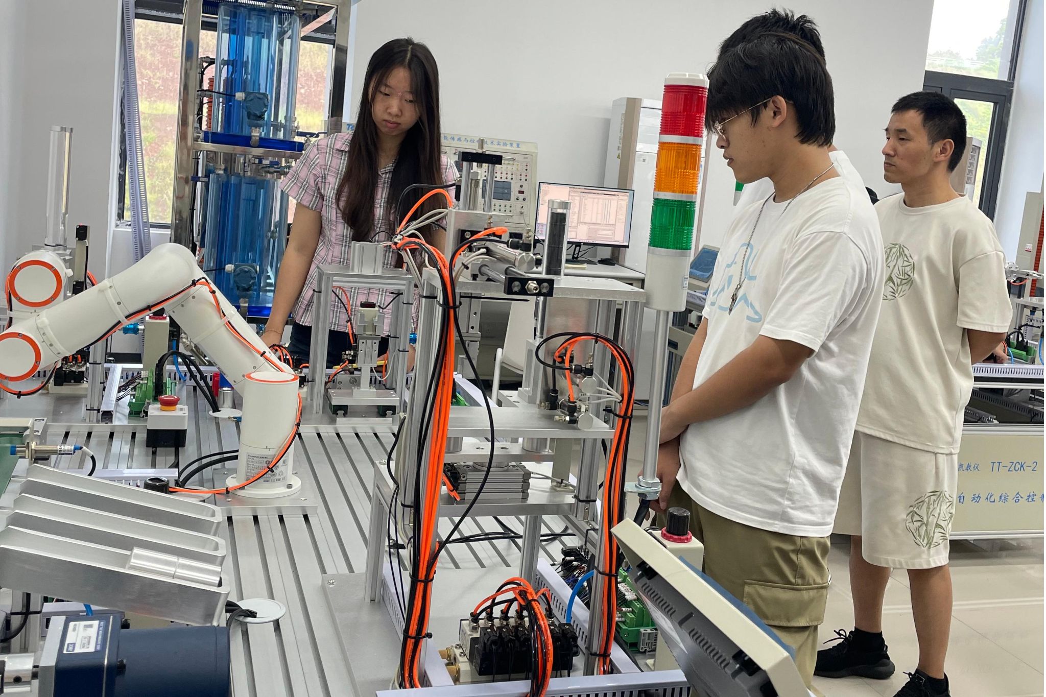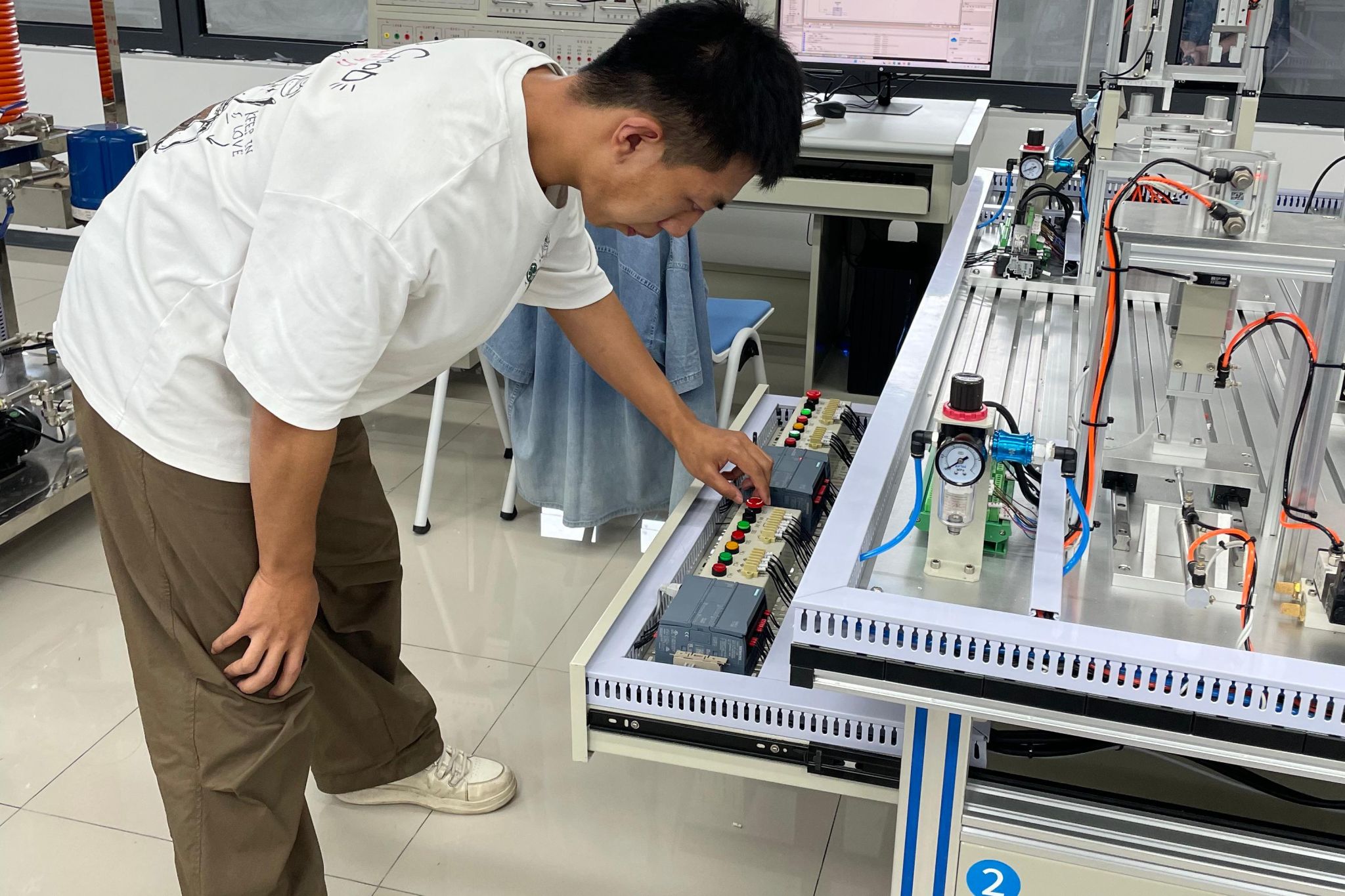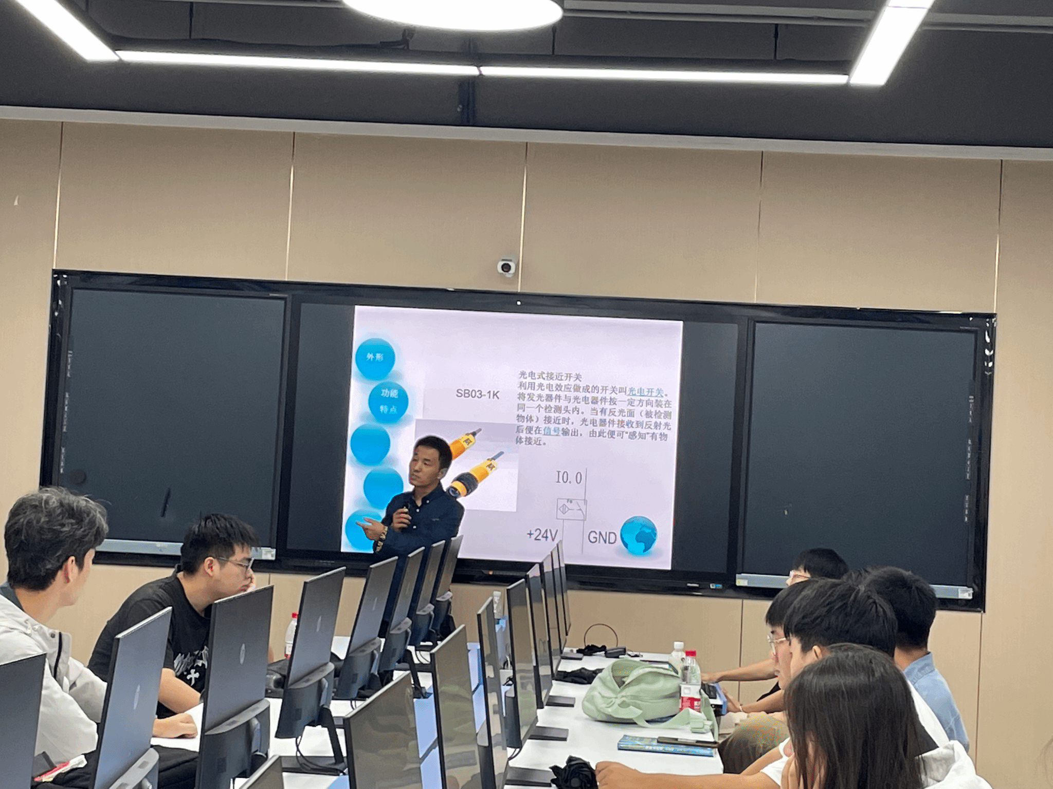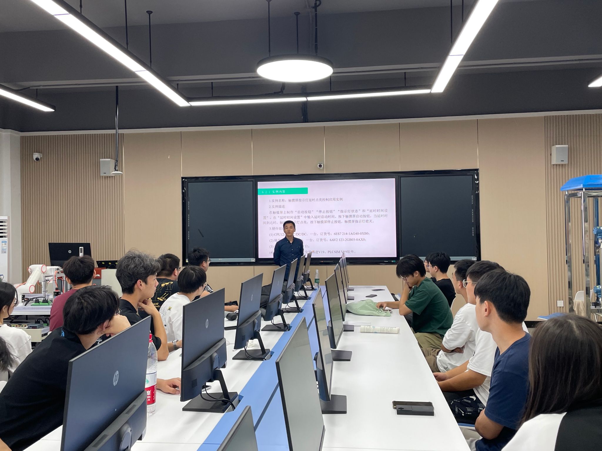 实习首日,郭工以自动化核心技术PLC为切入点。系统讲解了PLC的基础知识、在工业生产中的典型应用场景,同时细致演示了相关软件的操作流程与注意事项,并结合自动化课程的学习方法,为学生搭建起理论、软件到应用的认知框架。随后的实训环节则以实验室新建的工业自动化综合控制实训设备为应用载体,先从简单按钮控制三个灯的状态进行实践。围绕任务需求展开编程与调试,在解决实际问题的过程中初步掌握PLC在具体应用场景中的编程思路。