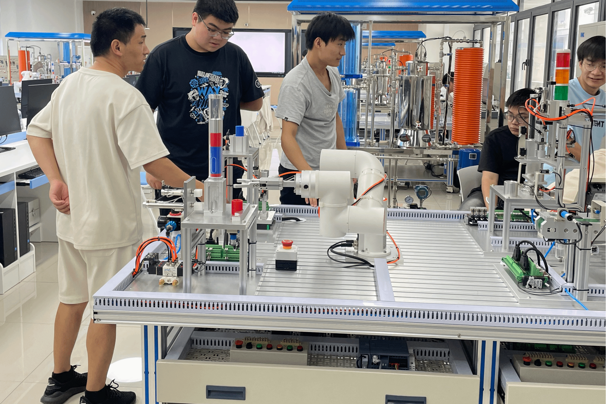 第二天的实习内容聚焦自动化系统器件与编程基础,同学们在实训场地中近距离认识自动化系统中的常用器件,从光电开关、磁性开关、光纤传感器等各类传感器,到不同规格的电磁阀、气缸等气动元件,郭国彬工程师通过实物拆解与原理讲解,让学生理解器件功能如何支撑系统运行;同时,结合器件功能分析其工作原理及接线操作,强化安全用电与规范接线意识。在此基础上郭工解析了工业自动化综合控制系统的整体构成及其通讯方式,梳理该系统编程的核心方法与易错点,并带领学生完成系统初始化编程,为后续复杂系统功能实现打下基础。