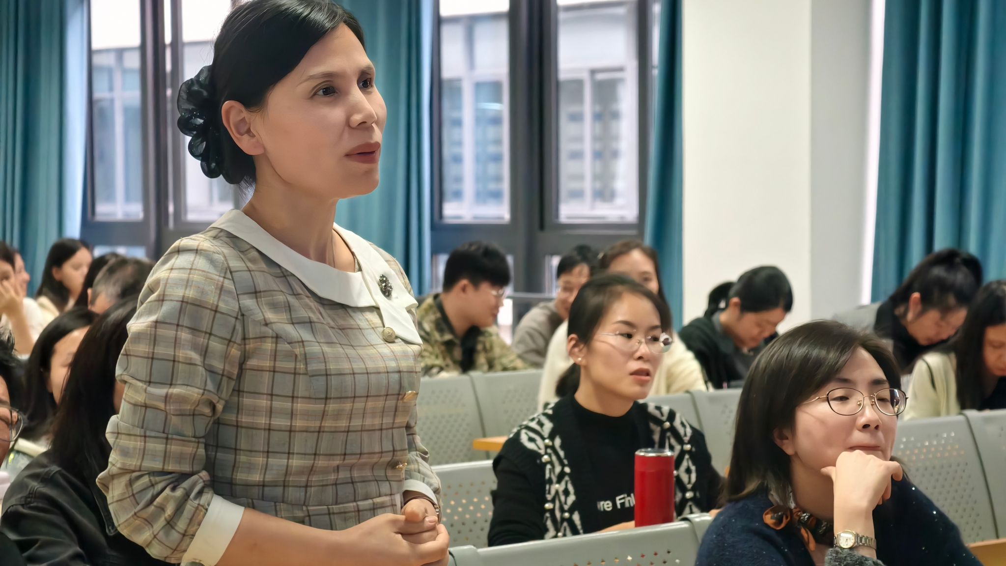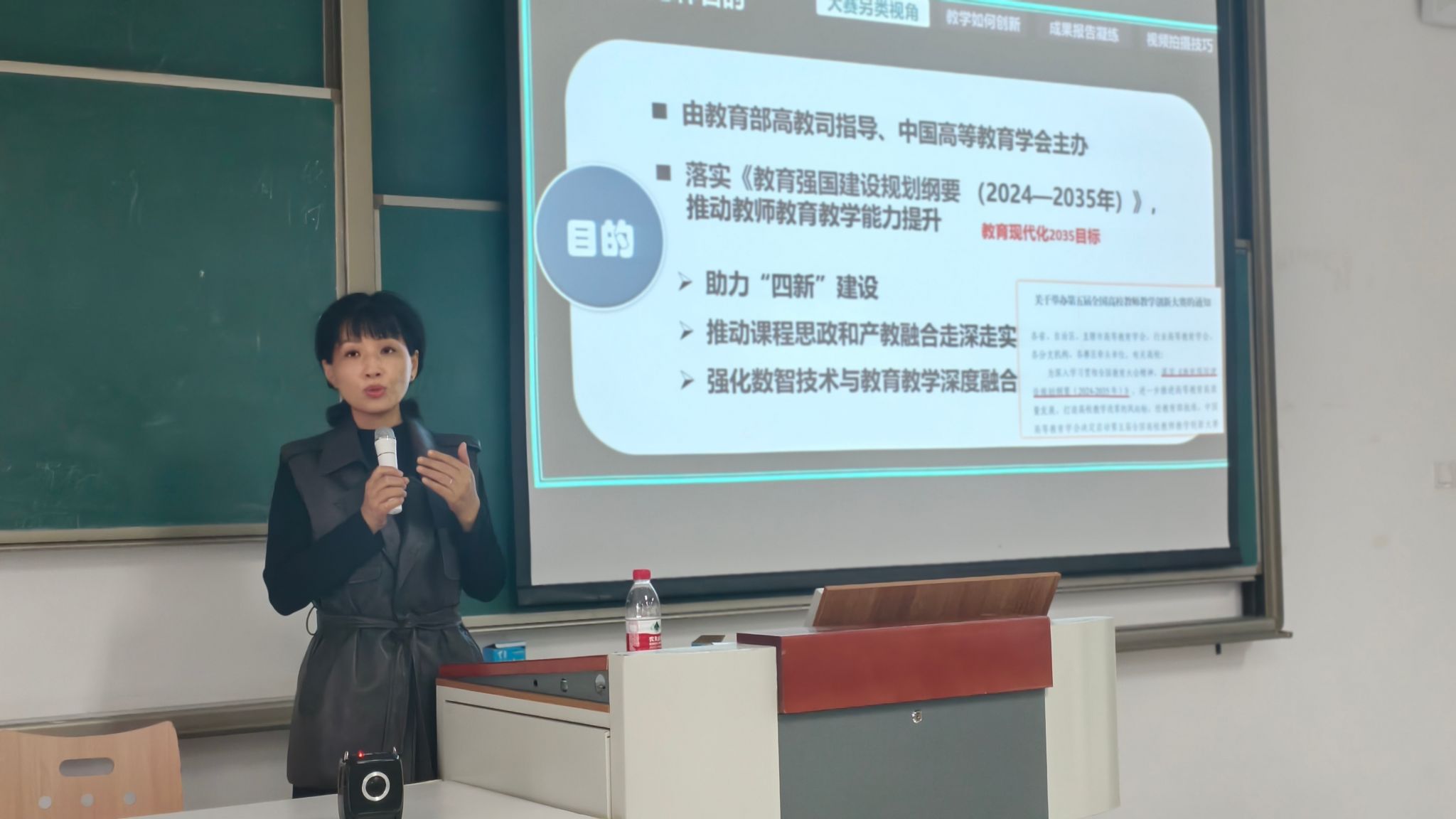 随后,何教授依托自身参赛积淀,深度剖析教学创新精髓。她强调,教学创新要紧扣时代脉搏,契合国家战略所向。谈及教学创新成果报告撰写,她条分缕析找准痛点、探索思路、落实举措、达成目标等关键步骤。同时,她倾囊分享视频拍摄要点,涵盖双机位布局、内容筛选、场地设备筹备等细节。何教授着重指出“真问题”引领、“学生中心”展现、“数据证据”佐证三大原则,为备赛铺就了一条可借鉴、易操作的实践之路。