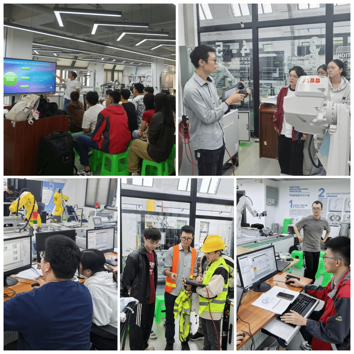10月10日-14日开展了第二批实习,在晁晓洁、邢阳阳、陈龙灿、罗森四位老师的带领下,2022级电气工程及其自动化3-8班的119明学生进行了小型自动化实训、自动化控制箱实训、ABB机器人与S7-1200 ProfiNET通讯配置等项目。实习团队专门组织参观了实训中心的“工业发展历程展”,了解我国从制造大国向制造强国迈进的历史性跨越,增强学生的民族自豪感和使命担当。在配置ABB机器人的过程中,学生们不仅了解了先进技术,更感受到了突破技术的重要性。老师们在指导时经常强调,核心技术是要不来、买不来的,必须靠自主创新,这让学生们更加坚定了科技报国的决心。