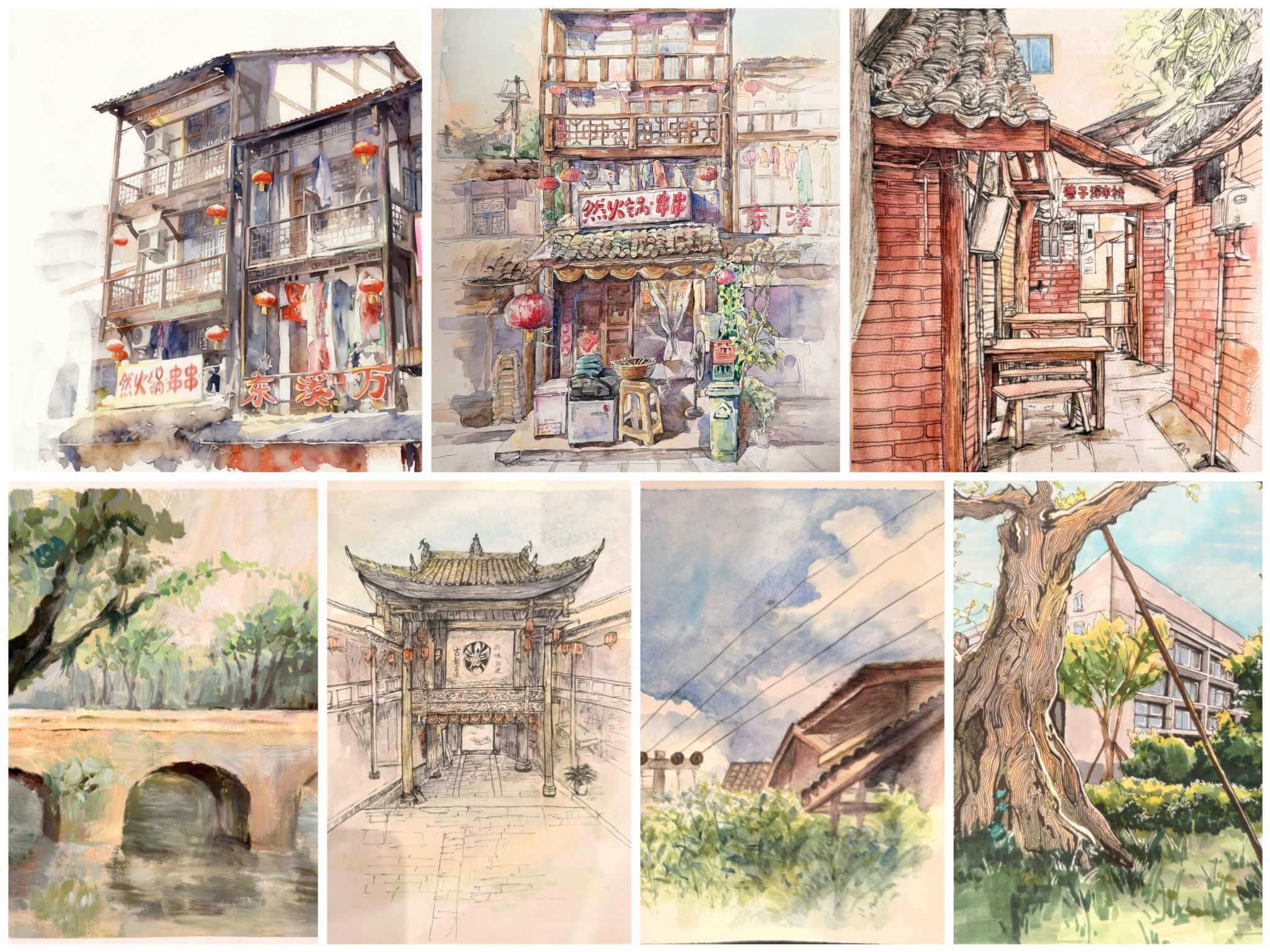 通过五天沉浸式的实践教学,学生们的专业素养得到了全面提升。在艺术表现方面,学生们通过对实景的观察与写生,显著提提高了构图取景、色彩运用与意境营造的能力;在专业认知方面,通过对传统建筑的实地测绘与记录,加深了对空间结构、建造工艺的理解;在文化素养方面,通过深入体验当地风土人情,建立了对巴蜀文化系统的认知和深厚的情感认同。这些收获充分证明了实践教学在艺术人才培养中的重要作用。